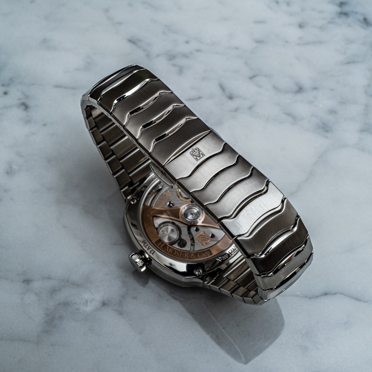Часы с 3 стрелками, как безусловная классика, требуют высочайшего уровня мастерства исполнения: каждая деталь должна быть безупречной. Сбалансированные, точные пропорции – это ключ к гармонии, что прекрасно демонстрирует модель Streamliner Centre Seconds. 40-миллиметровый стальной корпус в виде подушки с водонепроницаемостью до 12 ATM отличается выдающейся эргономикой: стальной браслет не имеет заметных креплений и полностью интегрирован в корпус. Центральная часть корпуса имеет вогнутые матовые боковые грани, а также чередование полированных поверхностей и поверхностей с крацеванием в стиле традиционной отделки корпусов Moser. Корпус увенчан утонченным куполообразным стеклянным сапфировым стеклом типа Glassbox, дополненным прозрачной задней крышкой. Продолжением этих округлых линий служит интегрированный стальной браслет, элегантной аркой обхватывающий запястье. Несмотря на сложную конструкцию, браслет имеет чрезвычайно плавные линии, вдохновленные органическими формами. Все звенья шарнирно соединены и создают мягкую волну, в которой вертикальная шлифованная поверхность сочетается с полированными поверхностями. Этот браслет – настоящее техническое чудо, шедевр утонченности, изысканности и гибкости.
