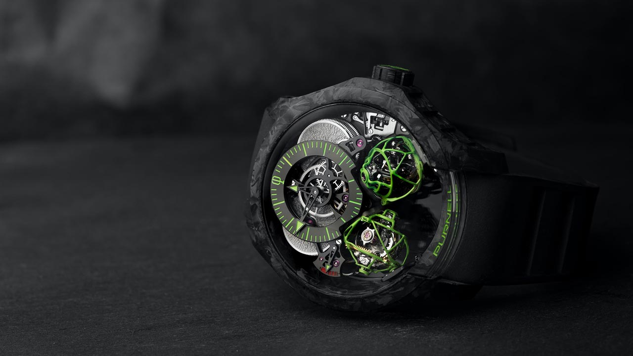 Компания Purnell была основана в 2006 году, ее основатель Джонатан Пурнелл говорит, что вдохновителем идеи создания компании был его дед Сесил, британский солдат, который получил ранения во время Первой мировой войны и восстанавливался после травм в Безансоне, Франция, где и начал изучать часовое дело. В рамках своего образования Сесил Пурнелл узнал о турбийоне и был поражен его конструкцией, и со временем передал интерес к высокому часовому искусству своему внуку. Джонатан Пурнелл проработал в часовой индустрии более сорока лет в таких компаниях, как Harry Winston и Vacheron Constantin, и когда он основал Purnell, то решил, что компания посвятит себя исключительно производству часов с турбийоном. Компания, представившая свои первые часы в 2009 году, осталась верной первоначальному принципу и в последние годы направляет свою деятельность на создание сверх-сложных часов. В 2019 году Purnell представили одну из самых впечатляющих своих моделей Escape II Spherion, которая имеет две трехосные турбийонные системы Spherion, объединенные дифференциалом, являющуюся одними из самых сложных с кинетической точки зрения наручных часов на сегодняшний день. В 2020 году Purnell представляют две обновленные модели Escape II Spherion в корпусах из «кованного» углерода или титана 5 класса с черным DLC-покрытием.