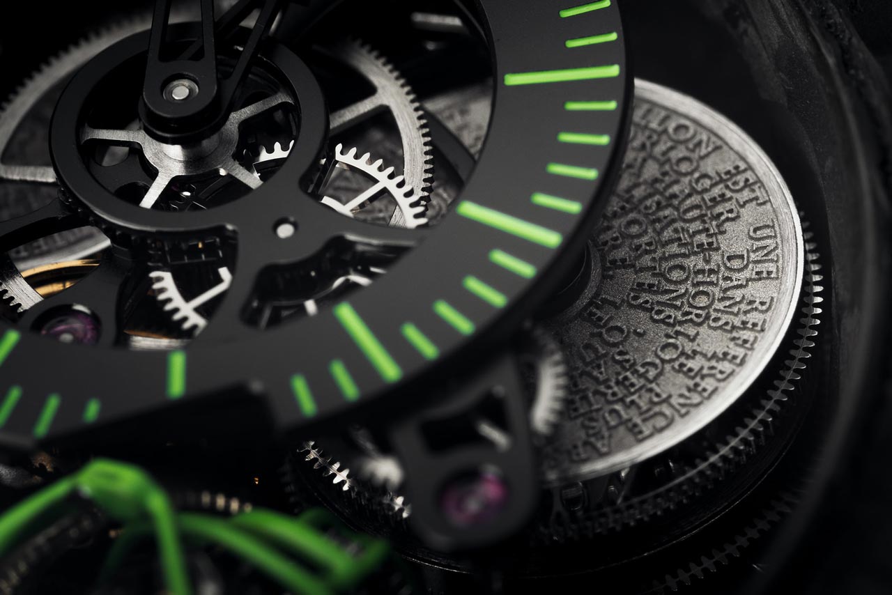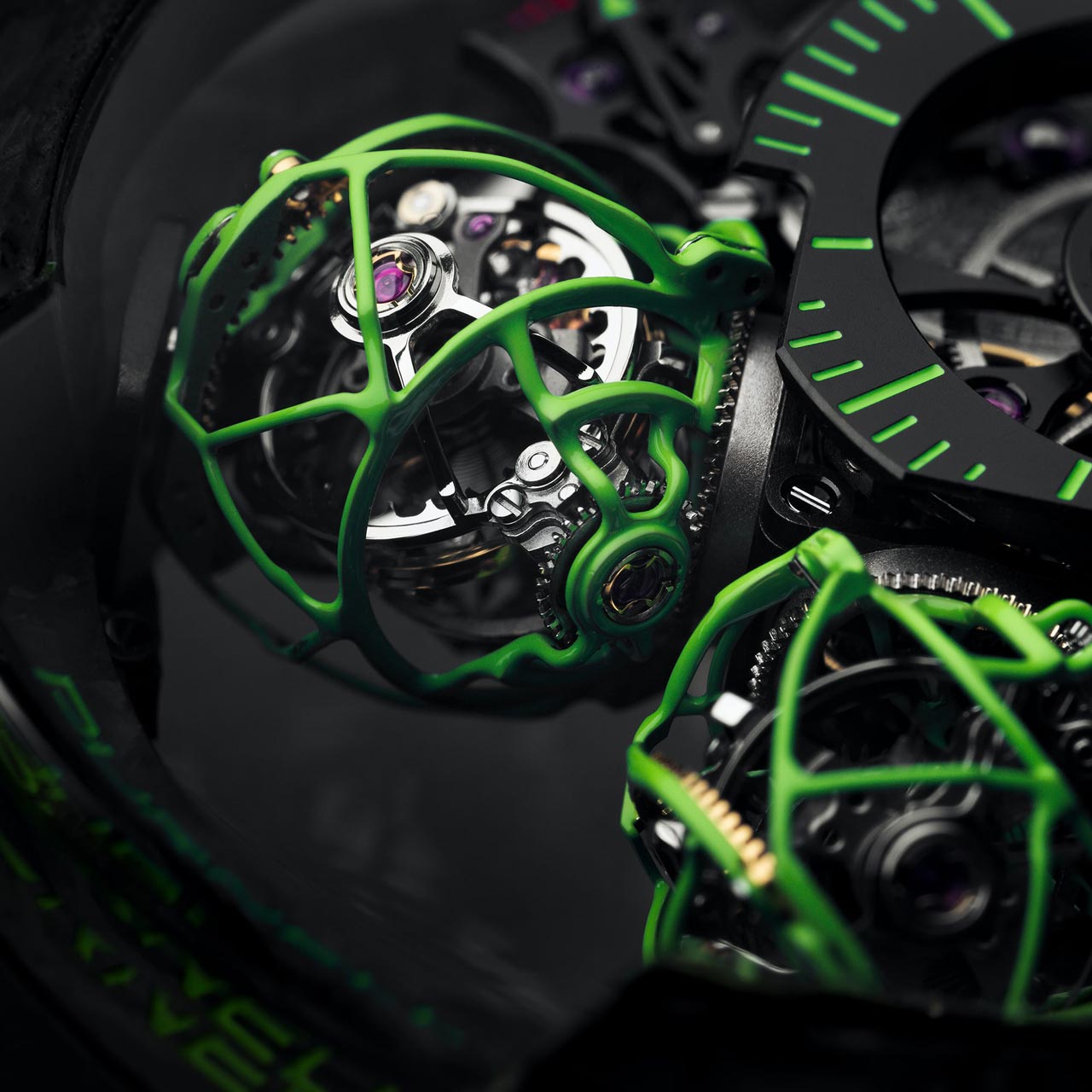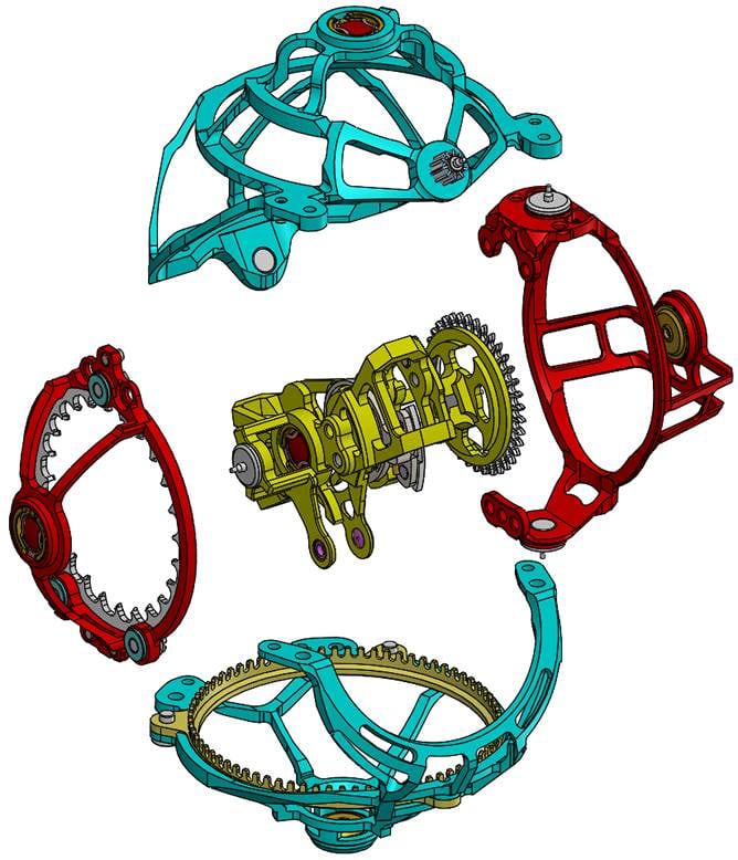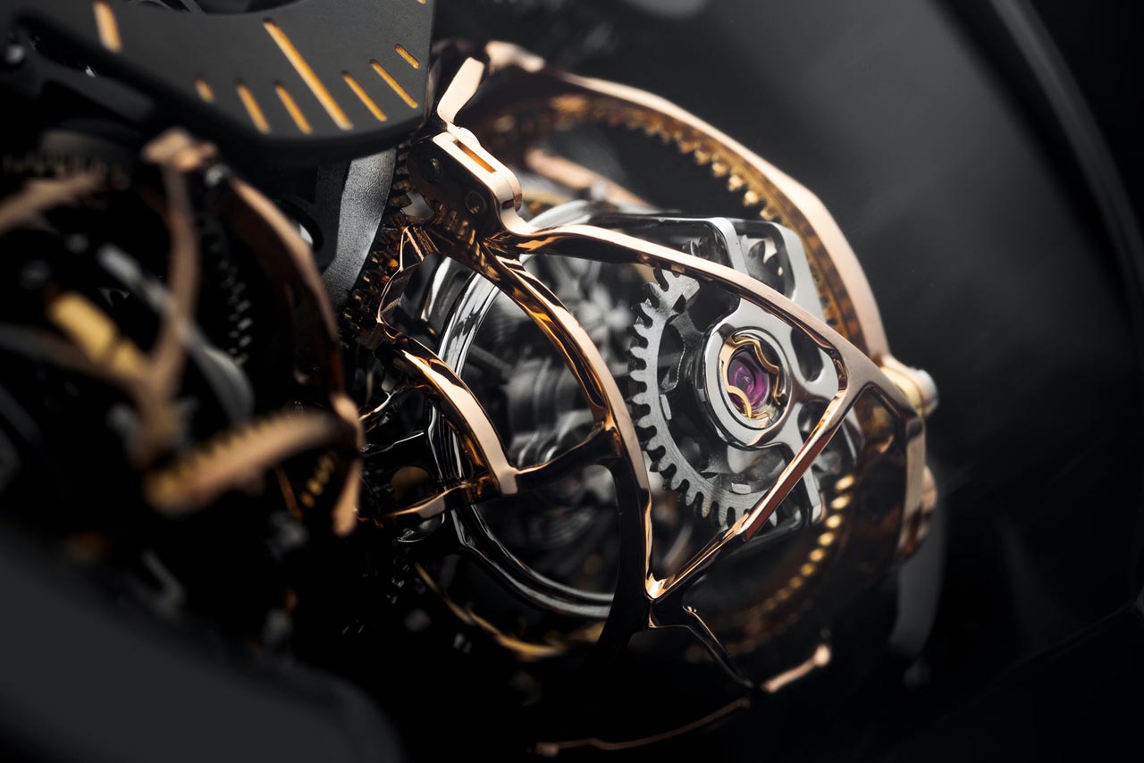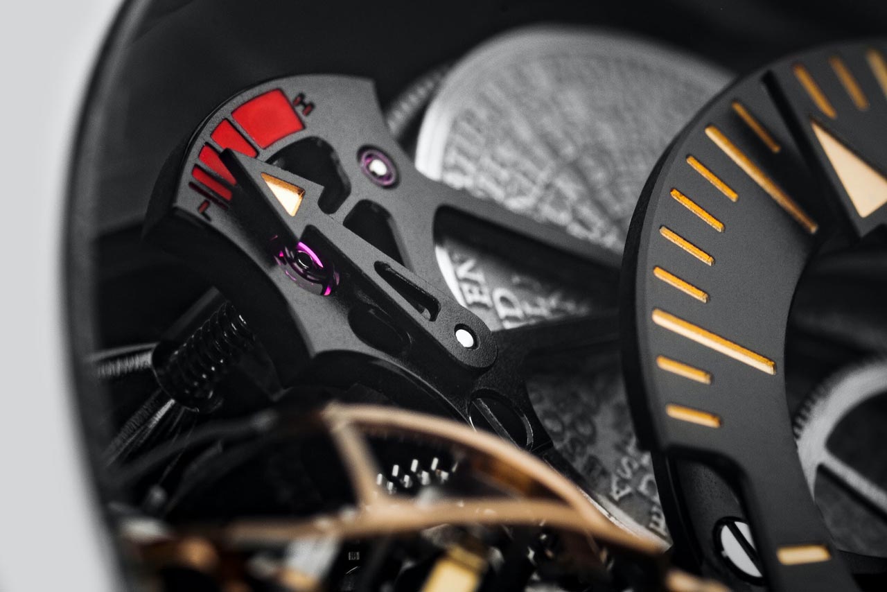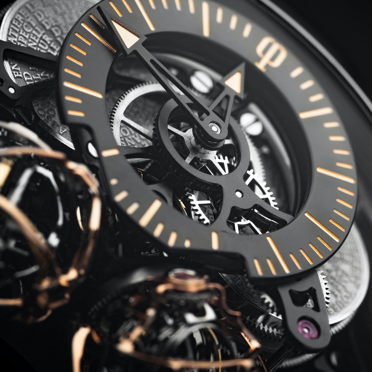 Механизм трехосного турбийона - детище часового мастера Эрика Кудре (Eric Coudray). Имя Кудре и по сей день не особенно известно энтузиастам, хотя его компания TEC Ebauches, базируящаяся в Валлорбе, является высоко ценимым источником сложных механизмов для таких производителей, как Louis Moinet, Manufacture Royale, MB&F и, конечно же, Purnell. Конструкция трехосного турбийона Spherion включает в себя три каретки, совершающие полные обороты за время 30, 60 и 8 секунд соответственно. Техническое решение проблемы работы трехосного турбийона на такой высокой скорости основано на особой конструкции спускового механизма, который был изобретен американским часовщиком Альбертом Поттером (Albert Potter) в середине 1800-х годов. Поттер родился в Олбани, штат Нью-Йорк, в 1836 году и переехал в Женеву в 1875 году, где и работал над карманными часами с очень необычным и узнаваемым дизайном. В его спусковом механизме используется фиксированное анкерное колесо с обращенными внутрь зубьями. Принцип спускового механизма Поттера используется в конструкции Spherion, анкерное колесо с направленными внутрь зубьями зафиксировано, и при вращении внутренних кареток паллеты анкерного рычага входят в зацепление с зубьями анкерного колеса, передавая импульсы крутящего момента на балансовое колесо. Вложение 3041798 Самая большая проблема с любым турбийоном заключается в том, что его механизм по сути является энергетическим паразитом. В классическом механизме четвертое колесо колесной системы напрямую приводит в движение анкерное колесо, которое затем передает энергию через анкерную вилку на балансовое колесо. Потери энергии происходят во всей колесной системе из-за трения (их можно уменьшить, но никогда не устранить полностью), а также в самом спусковом механизме из-за трения скольжения на паллетах анкерной вилки и ее геометрии. В турбийоне проблема усугубляется тем, что колесная система должна приводить в движение не только анкерное и балансовое колеса, но и саму каретку турбийона, справляясь при этом с её инерцией, и вся сложная конструкция должна запускаться из неподвижного положения каждый раз, когда анкерная вилка разблокирует анкерное колесо. По этой причине исторически сложилось так, что даже обычный турбийон должен быть сконструирован и изготовлен с очень высокой степенью точности, а каретка всегда делалась как можно легче, чтобы уменьшить нагрузку на колесную систему. В конструкции трехосного турбийона все проблемные моменты с потерей энергии усиливаются многократно, особенно учитывая высокую скорость вращения кареток. По этой причине титан является широко используемым материалом в конструкции, а зазоры между каретками минимальны - от 0,1 до 0,2 мм - и весь турбийон Spherion весит всего 0,79562 грамма. В каждом Spherion используется восемь противоударных систем Incabloc - по две на каждую из трех кареток, плюс еще две для балансового колеса. Вложение 3041796 Вложение 3041797 Собранная воедино, вся умопомрачительная конструкция механизма caliber CP03, упакована в корпус весьма разумных размеров - диаметром 48 мм и высотой 19 мм. Корпус спроектирован таким образом, чтобы максимально раскрыть магию движения двух трехосных турбийонов, в нижней части находится обзорное окно, фактически являющееся частью цельного сапфирового стекла, защищающего механизм сверху. В боковой части корпуса также есть несколько окон, и в цел