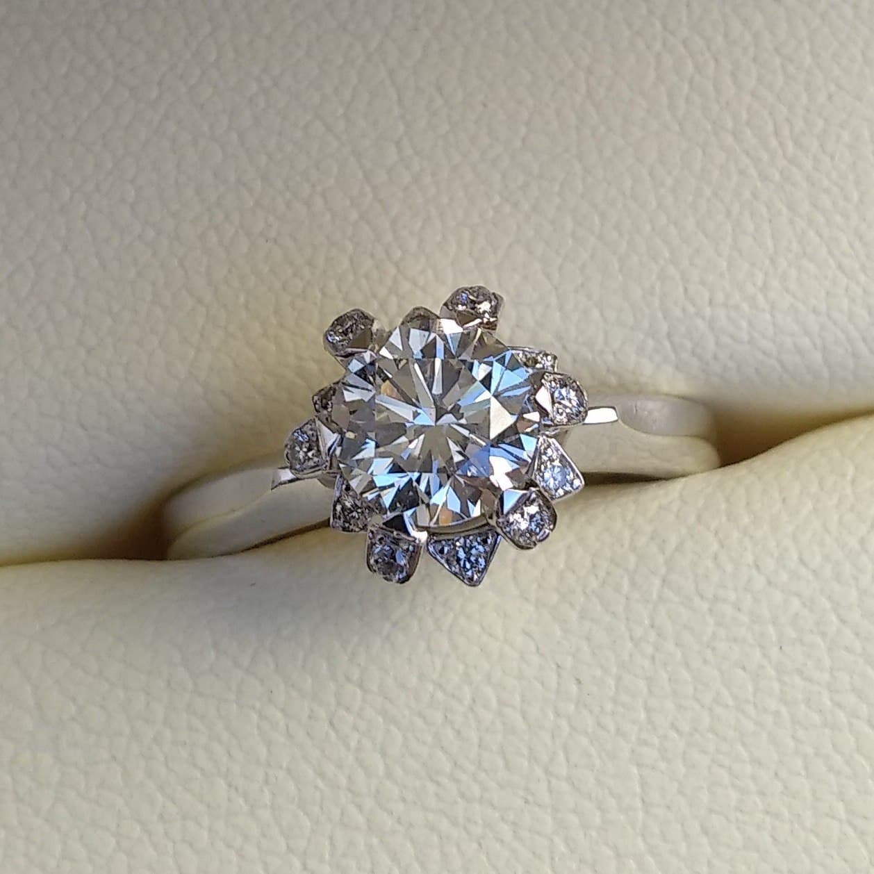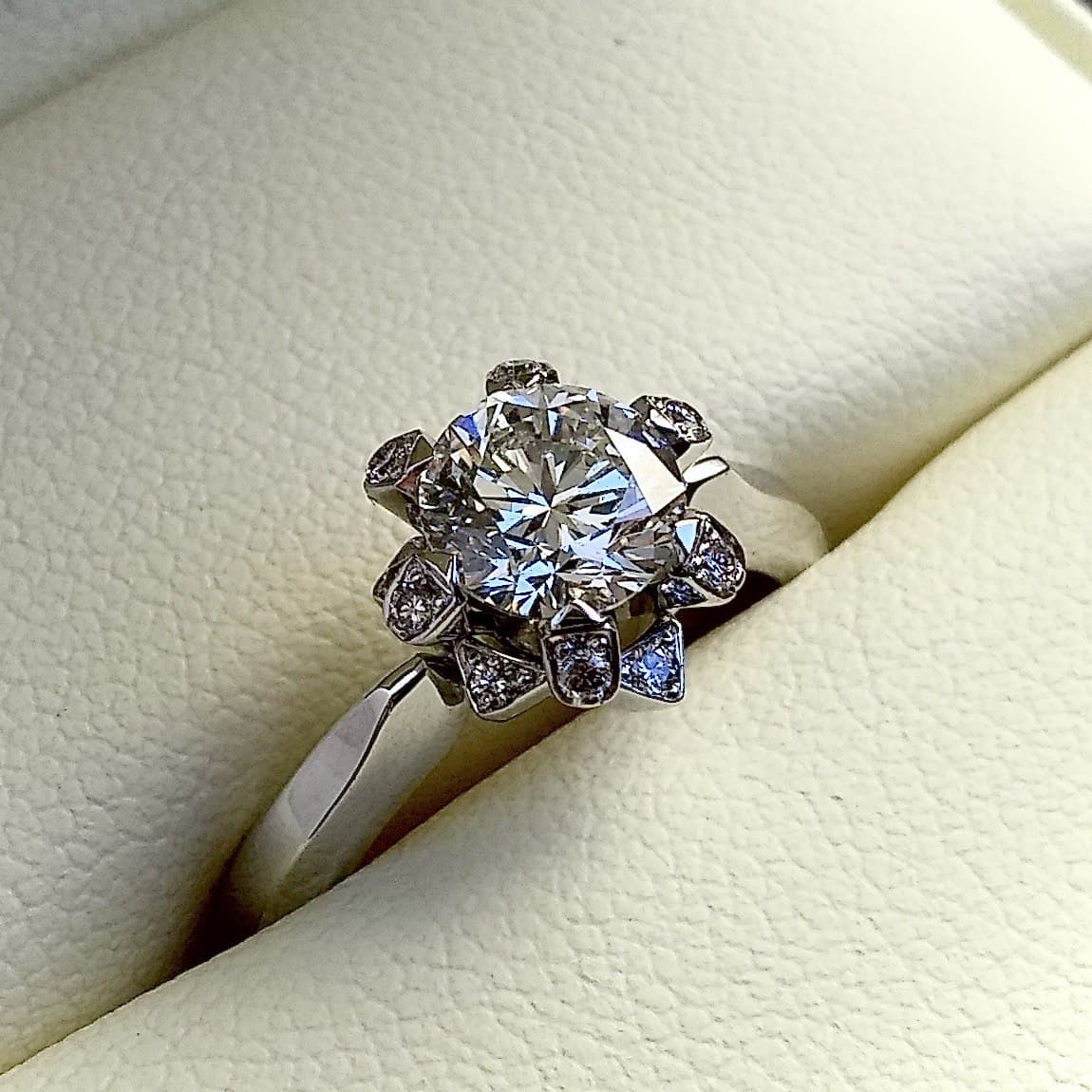 Вес 1ct. Цвет H Чистота VS1 Окружен по кругу в лепестках в два ряда так же природными бриллиантами круглой огранки в количестве 12 штук массой 0,1ct. цветом 3(G) и чистотой (I1). Облагораживание отсутствует (N). Золото 750 пробы. Имеется оригинальный сертификат на изделие от лабораториии МГУ, подписанный А.В. Столяревичем. Возможно подтверждение в лаборатории МГУ в присутствии покупателя. Цена 8000$. |