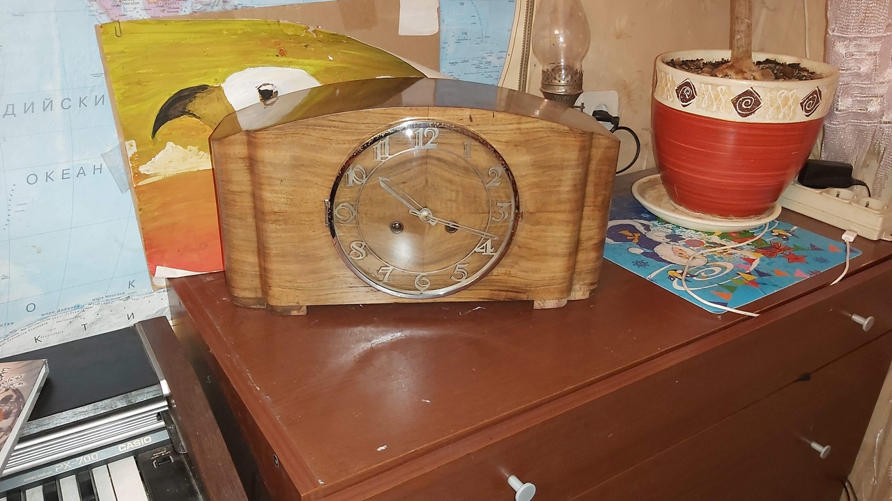Предлагаю небольшой обзор не частого Мауте 1934го года. Стандартный механизм превращен в музыкальный дополнительным блоком, который может проигрывать на полчаса или мелодию или бим бам (выбирается переключателем) и на полный час - количество часов 3мя молоточками. Часы были в принципе в неплохом состоянии, только лишь был покрашен краской безель и цифры со стрелками. Сам безель оказался хромированым, отмыл, а стрелки и цифры серебреными - восстановил ляписом. Стекла не было, заказал под размер. Немного обидно, что шпон подвыгорел, был темнее, но решил ничего не делать, чтобы не менять старый лак, который весьма не плох. Долго не знал что за мелодия, пока люди не подсказали - Volks-Gong. Пропагандистский марш 3го рейха "Volk ans Gewehr!". Припев из него. Этот же припев был позывными на радио до 1945го года. После чего песню запретили и большинство часов с таким гонгом по этой причине пропало. Часы нашел в Ростове на Дону... https://youtu.be/rjmz79hlui4 Вложение 3167046 |