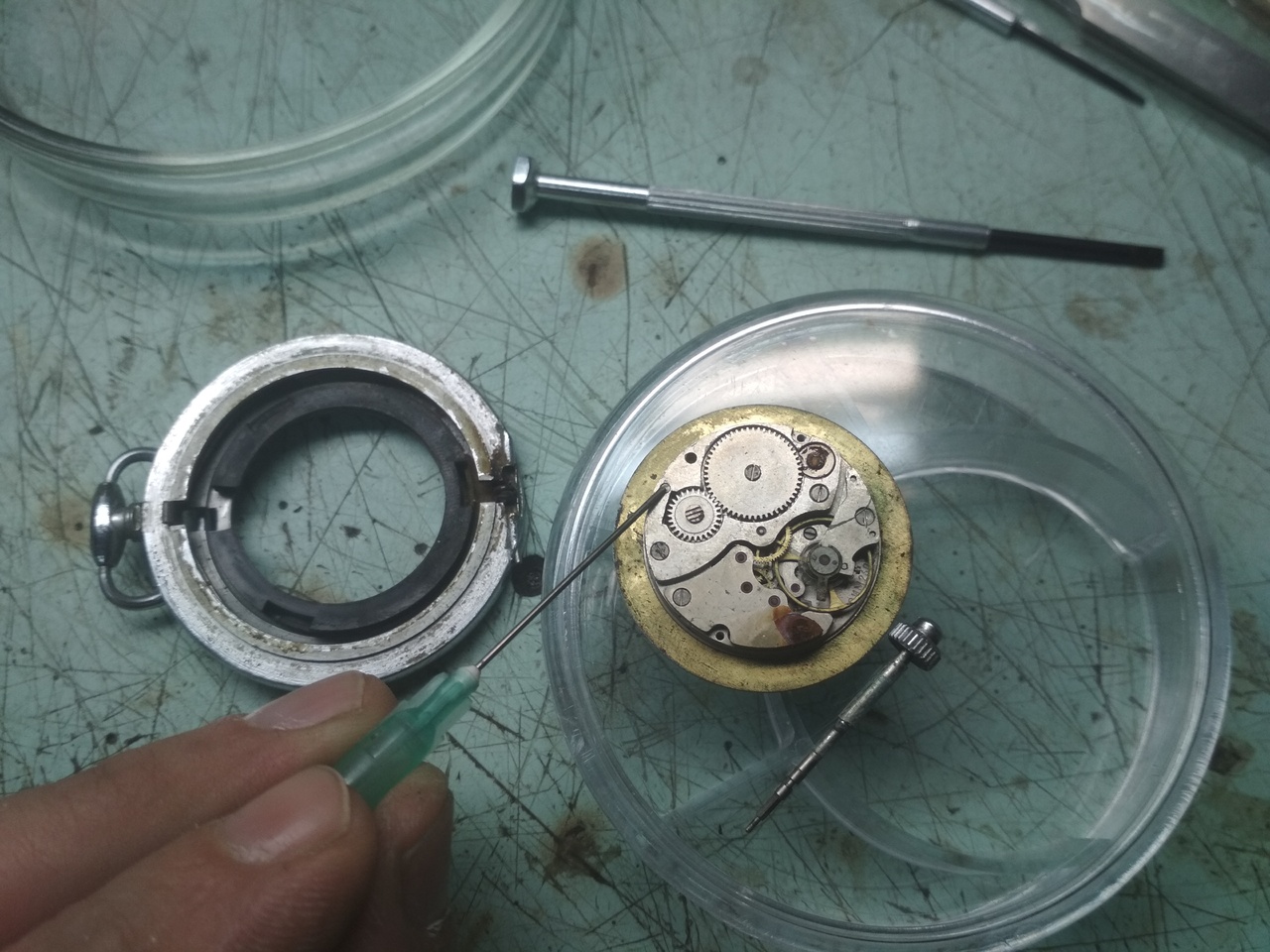 Вот и я "вляпался" в это увлечение. Уже набраны всякие разные часы. Большая часть - механика, но есть и электромеханические и электронные. Есть и некоторый инструмент и приспособления. Попробую выложить снимки с телефона. За качество сразу извиняюсь. Прочитал всю тему про смазку (80 с чем-то страниц) и купил на Мешке у FSkastera масло от компании "Микромеханика": мц-н, мн-30 и мн-60. Заказал в Китае часовые отвертки и пинцеты, но они до сих пор идут.. Кое что из инструмента купил здесь, на форуме. Начал читать часовую литературу... В общем, в этой теме буду выкладывать свои "успехи". Возможно кому-то пригодится. Вот фото инструмента который пока есть Вложение 3203562 Вложение 3203561 |