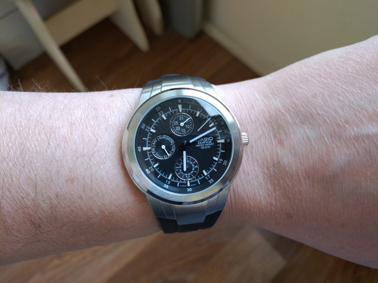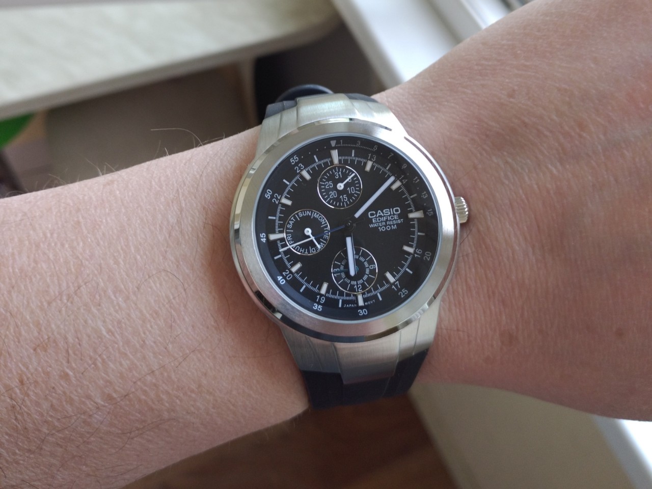 Вложение 3219885 Вложение 3219886 Вложение 3219887 Casio EF-305-1AV 40 мм, купольная минералка, 100 м водозащита, люм умеренный на стрелках и метках. Брал за 50$. Не хронограф :) Фото на руке 17,5 см. |