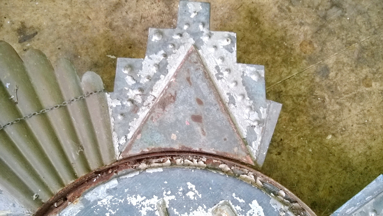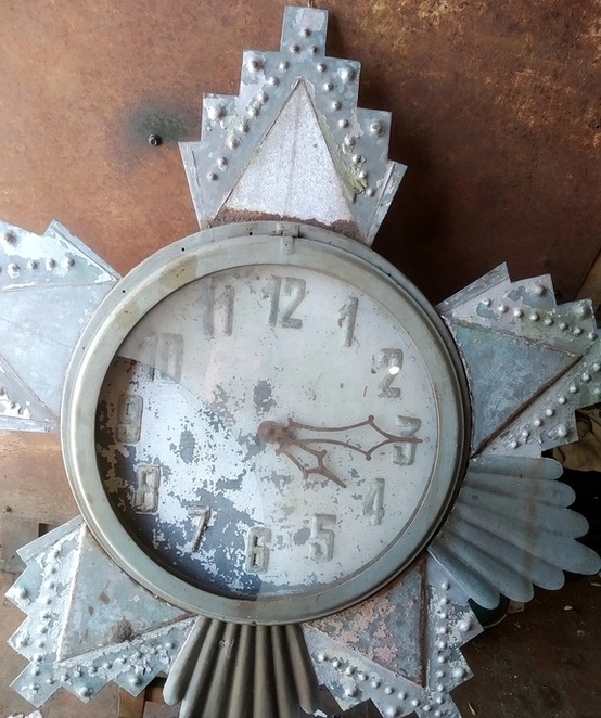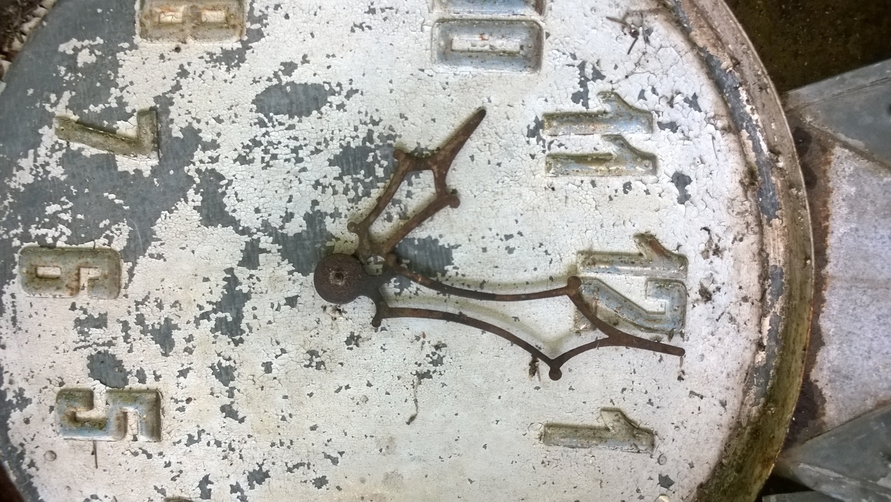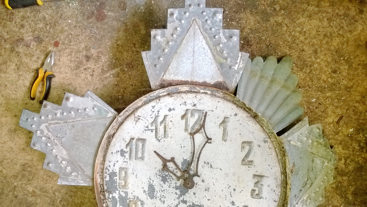 Здравствуйте, уважаемые господа. Попались вот такие часы, хотелось бы хоть что то услышать по этому поводу. За более чем 20 лет в этой теме такого чуда не встречал. В диаметре около 1м. Все из оцинкованной стали. штамповка. Цифры хромированные, приклепаны. Есть передняя крышка со стеклом и задняя глухая с окошечком. Были окрашены серебрянкой, вишневой и бронзовой краской.