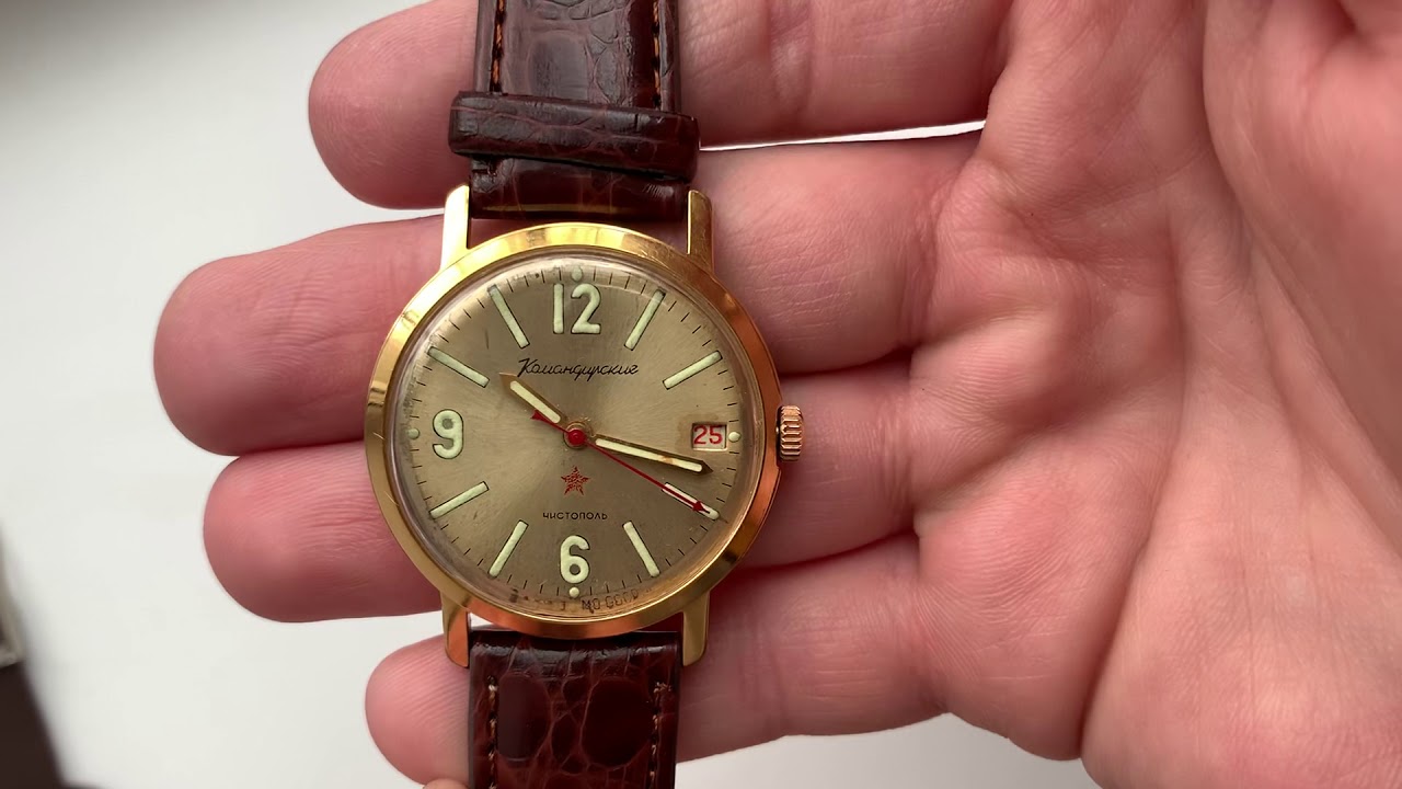 Тут двух мнений и быть не может, этот циферблат начал свою жизнь на заводе в совсем другом, некруглом корпусе, да еще и в хроме. Синие - в хроме.