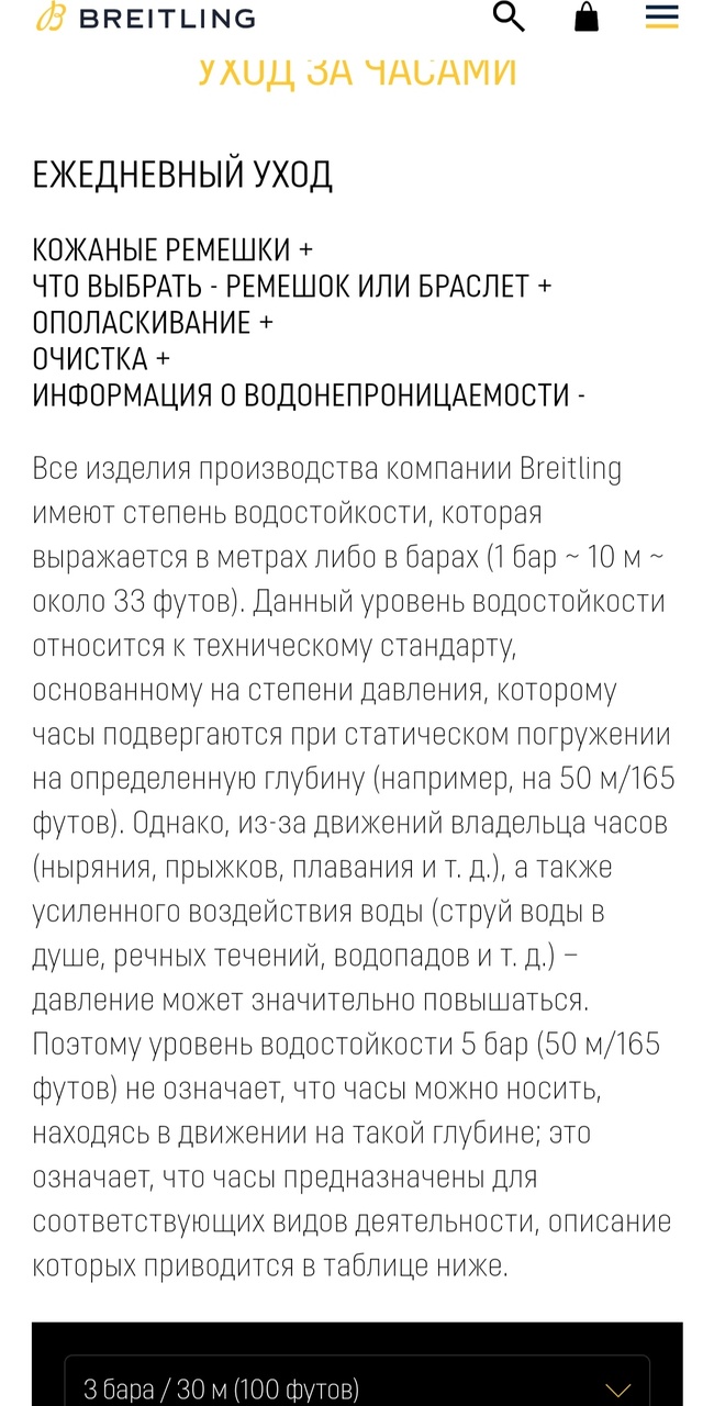Далее, можно зайти на официальную страницу Breitling, найти раздел, выбрать характеристику 100м и узнать, что с часами в воде можно делать. Если же всё-таки желаете с Premier погрузиться на 100m, то на официальном сайте есть раздел с ориентировочными ценами на ремонт. |