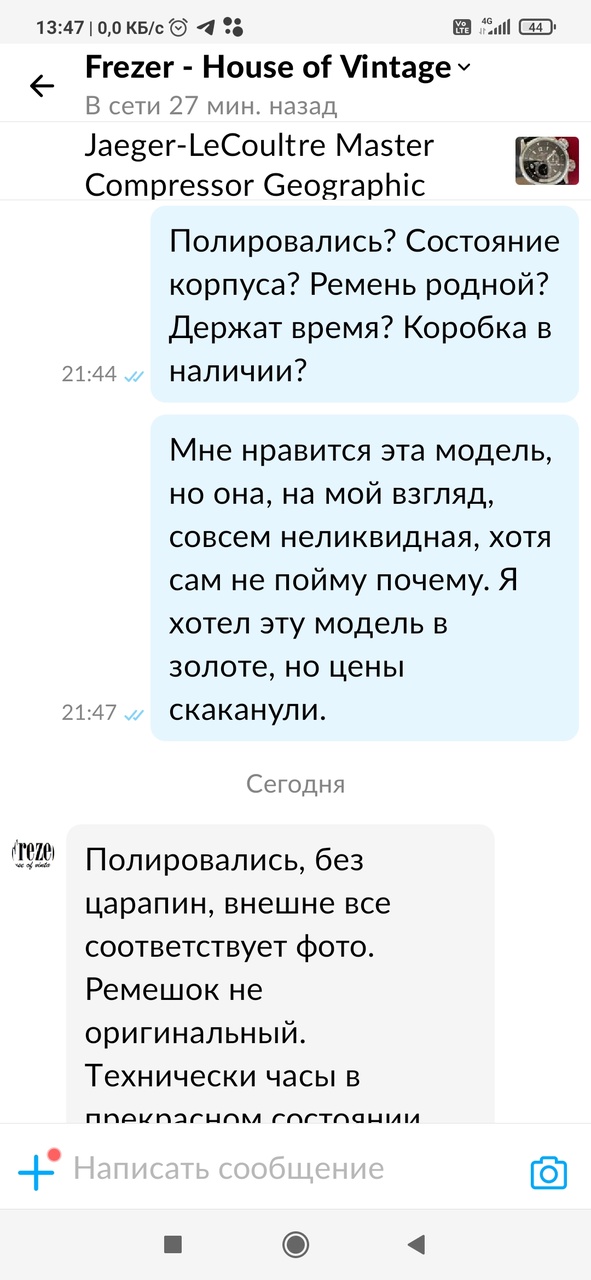 Ну, покупая часы за полляма, как минимум надо обратить внимание на подлинность. М. Авиамоторная- это, вероятно, часовой салон Фрейзер? Мнения разные о них, лично я ни какому полюсу не склоняюсь ибо дела с ними не имел. Но осторожность не помешает, деньги ваши)) И не только в подлинности, но и в ходе механизма. А это можно выяснить только оним способом- назначить встречу в мастерской и всё проверить. Сами по себе ЖеЖе шикарны, канешн))