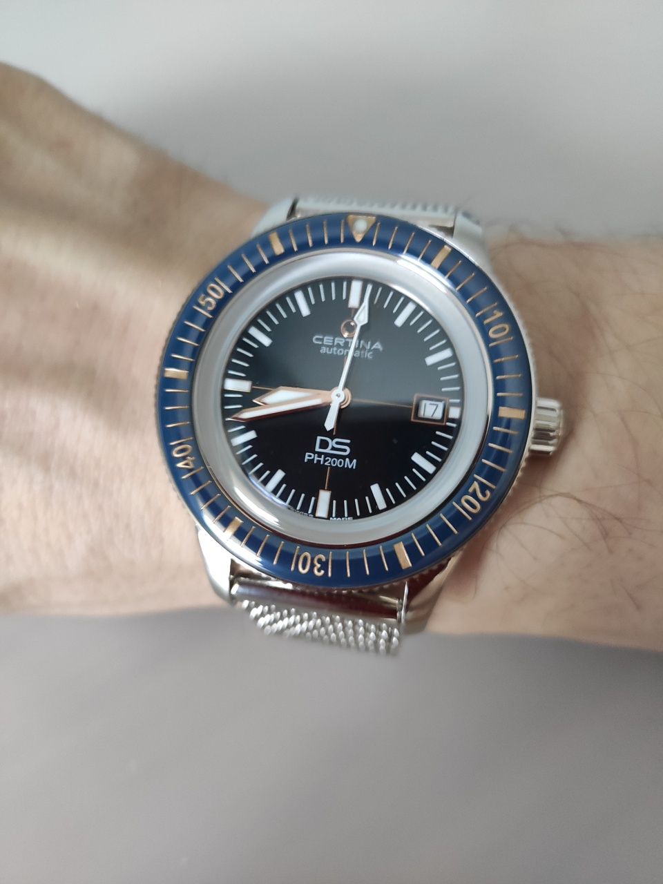 Планирую на день рождение приобрести часы Certina, не могу определиться между двумя моделями - Certina ds action diver 38mm (далее буду называть 38мм) и Certina ds super ph500m (далее буду называть 43мм). Примерил обе модели - фотографии приложу. Почему завел обсуждение - есть сомнения в каждой модели. В 38мм странное ощущение легкости и не самой лучшей застежки на браслете, также сомнения в безеле, интересно, насколько он будет практичен.. В 43мм безель также алюминиевый, однако ощущается на этой модели совершенно по другому, в хорошем смысле этого слова. Сомнение лишь в размере, у меня запястье в обхвате очень узкое ~ 16см, а также из-за высоты корпуса часы не "облизывают" мою руку. Расскажите, за что лично бы вы выбрали каждую из моделей? Стоит ли мне переживать, что 43мм сидят крупновато на моем запястье, или же это дело вкуса? |