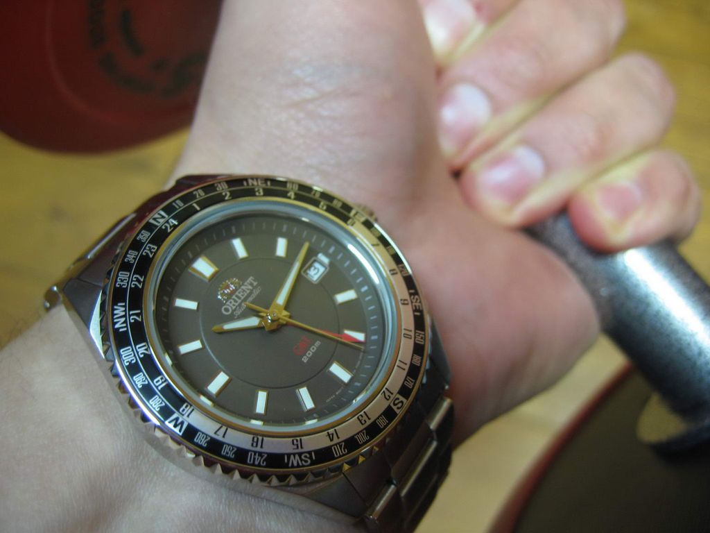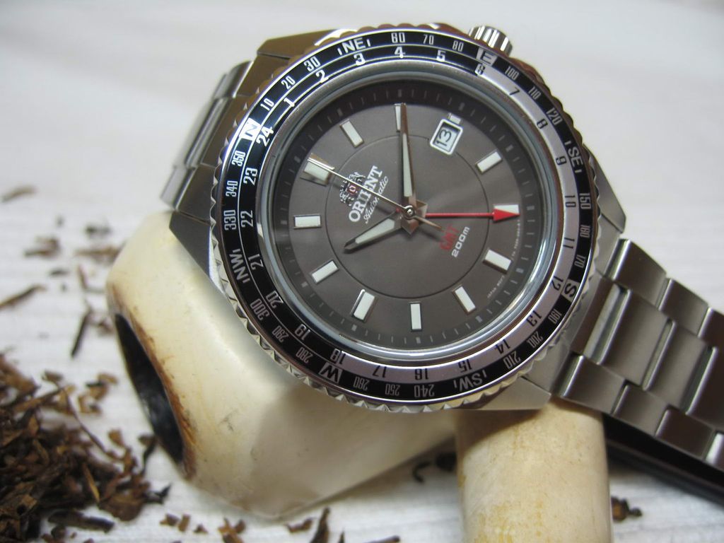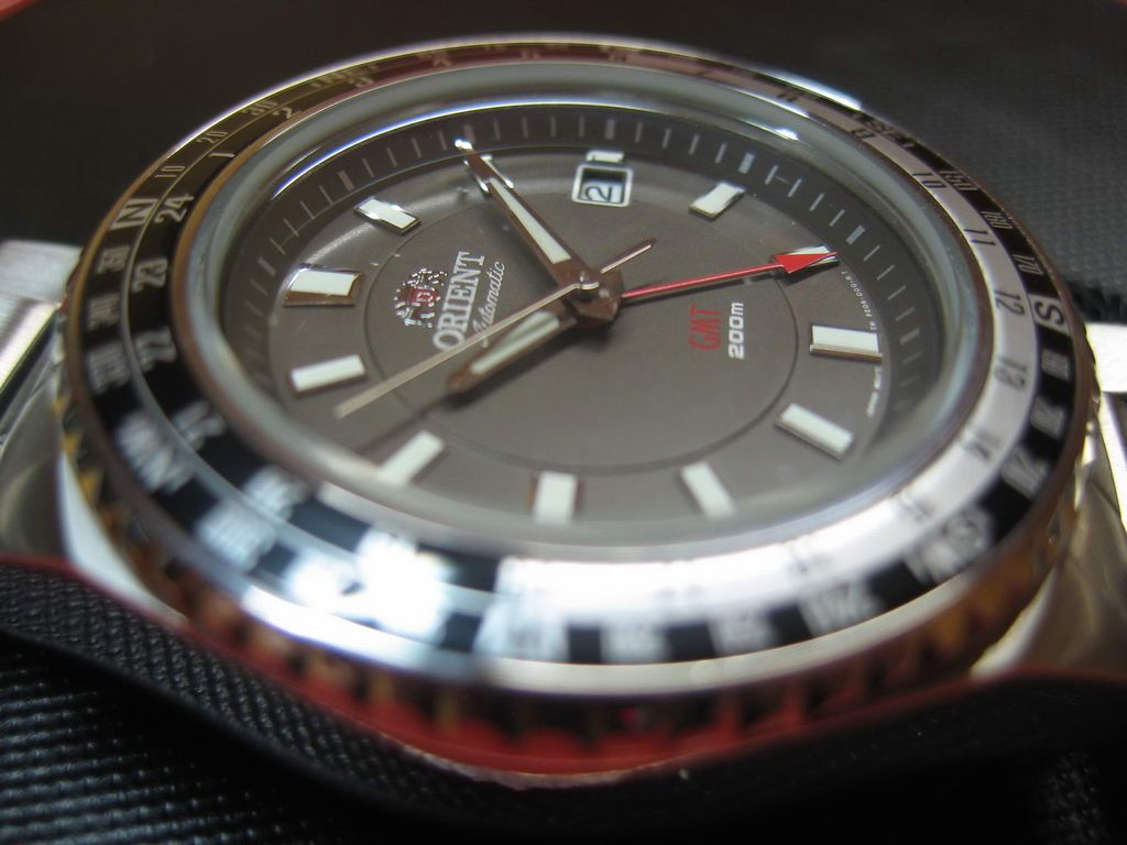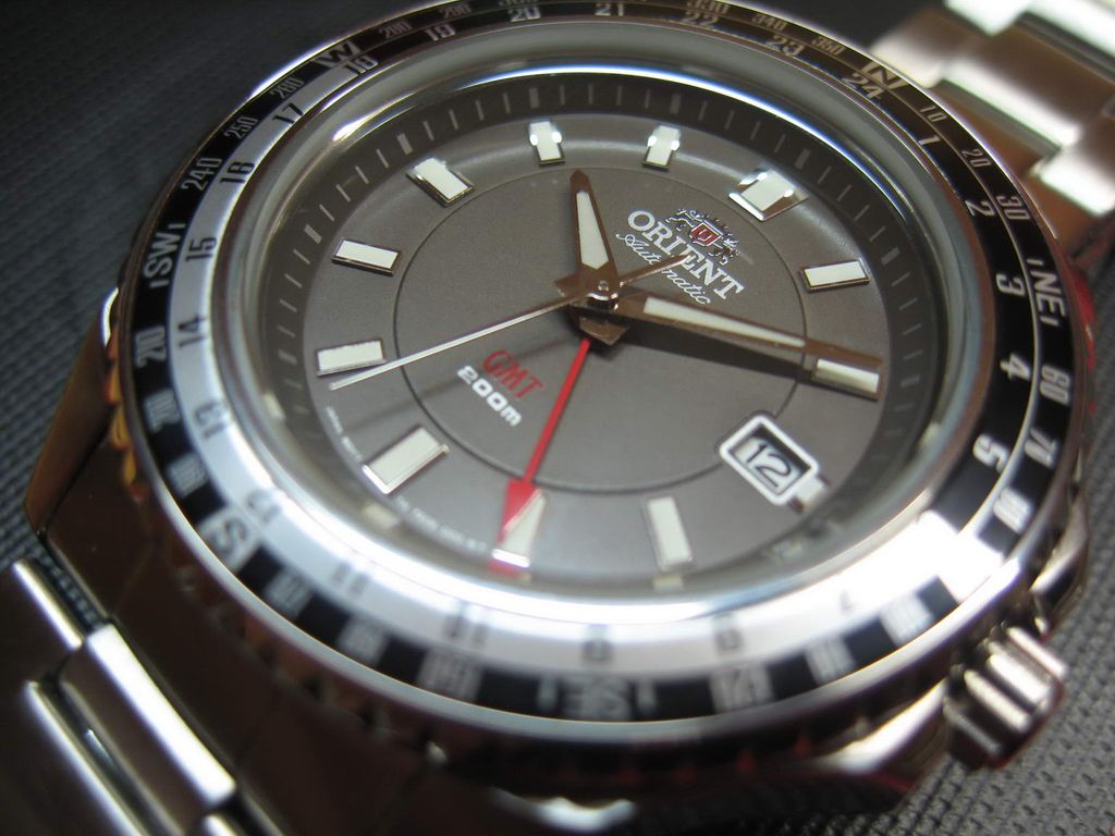 Информация взята: http://www.watch-hub.ru/blog/ORIENT/...SPORT_GMT.html Статья by (c)AlexSan Рассматриваются модели FFE06001B0 и FFE06001W0. В моем обзоре речь пойдет о модели с серым циферблатом FFE06001K0 Итак, основные функции этой модели - дайвинг и второе мировое время (GMT). Между делом они еще показывают и основное время. Стандартный трехстрелочник с усложнениями: четвертая стрелка показывает время другого часового пояса, а толстое стекло и специальный корпус помогает выдержать погружение с аквалангом. Вложение 101424Вложение 101425 Вложение 101426Вложение 101427 Описание модели Часы полностью изготовлены из нержавеющей стали 316L. Это немагнитная неаллергенная сталь, которая используется в медицинской и химической промышленности. Размер корпуса 46 мм по диагонали, или 49 мм вместе с головкой, длина корпуса от ушек до ушек - 50 мм. Толщина примерно 13 мм. Достаточно массивные. Корпус по бокам отполирован до зеркального блеска, местами сатинирован. Закручивающуюся головку окружают защитные приливы. Головка выдвигается на два щелчка. На первом меняется дата, на втором время. Сверху на корпусе имеется традиционный безель, только он не предназначен для индикации времени погружения, а показывает 24 часа GMT и стороны света. В отличии от стандартного безеля Мако и нового Мако, этот безель крутится во все стороны, а не против часовой стрелки. Что и понятно, так как функциональность его сильно отличается. И количество щелчков тоже отличается, если в Мако 60 щелчков, то здесь 72, т.е. каждое деление равно 7,5 градуса. Вложение 101428 Расшифровать надписи на безеле достаточно легко: Север N , Юг S, Восток E, Запад W, Северо-восток NE, северо-запад NW, юго-восток SE, юго-запад SW. Не смогли запомнить? Не беда, поверьте, на глубине 200 метров, вам будет все равно, с какой стороны света на вас нападает акула. Узнать, как пользоваться компасом, можно по этой ссылке http://www.clockshop.ru/readnews.php?nid=43 Вложение 101429 Стекло стоит утолщенное, закаленное минеральное. Как обычно у дайверов, из-за утолщенного стекла, вы не сможете быстро проверить водозащиту в приборе сухой проверки герметичности, так как стекло не сможет искривится при повышении в колбе давления. Придется нанимать водолаза для проверки на практике. Задняя винтовая крышка частично полирована, частично сатинирована, с шестью пазами. На крышке имеется гравировка, изображающая логотип компании и ее название, а также слово Automatic. По окружности имеются надписи - WATER RESISTANT 200M ALL STAINLESS STEEL ORIENT WATCH CO LTD KY FE06-C0-A CA Вложение 101430 Браслет шириной примерно 21 мм. Звенья литые, 13 штук, из них 6 регулировочных. Браслет полностью сатинирован, за исключением полированных торцов звеньев. Замок раскладывающийся, на двух кнопках, с предохранительной скобой. Т.е. просто так часы с руки не спадут. Складывающиеся скобы отполированы, и на них изнутри выдавлена надпись STAINLESS STEEL. Замок имеет три микрорегулировочных отверстия для точной подгонки. На замке выдавлен стандартный логотип и надпись ORIENT канатиком. Вложение 101431Вложение 101432 Циферблат простой, без особых изысков, с широкими индексами. На индексах, часовой и минутной стрелках, нанесена светомасса. На секундной стрелке и на стрелке GMT светомассы нет. Стрелка GMT красная, с острым наконечником. По окружности циферблата имеются мелкие риски. На цифре 3 имеется окно с числом месяца. Надписи: лого, ORIENT, Automatic, GMT, 200 m. Внизу циферблата микрошрифт: Japan movt, TM, FE06 000 Вл