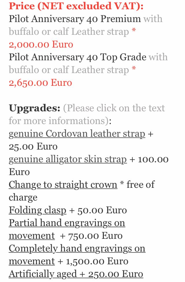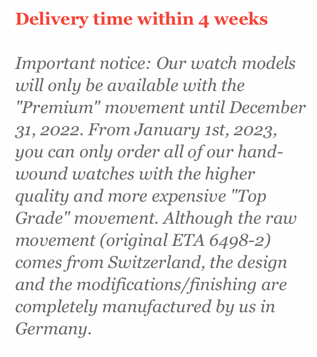 Very rare PREMIUM manual wind movement. Base movement: Swiss Made ETA Unitas 6498-1 Diameter 37.2 mm Height 4.5 mm Manul wind Hour, minute and small second 18.000 A/h beats per hour 17 Jewels 52 h power reserve ETACHRON Incabloc anti shock proof Our modifications: 3/4 bridge Pressed Chatons Blued screws Swan neck fine adjustment Skeletonized winding wheels with Sunburst patter Pearl decoration on escapement bridge Round-cut (Cotes de Circulaires) on movement bridges Round-cut under the winding wheels Rose gold plated or rhodium plated Fine adjusted in 5 positions Accuracy bewteen -2/+8 seconds per day (after movement encased) Available with rose gold or rhodium (silver color) plated. А "простые" продавать перестали. Впрочем, я не утверждаю, что это хитовая модель с отличным соотношением цены и качества. Дорого, конечно. За новые... |