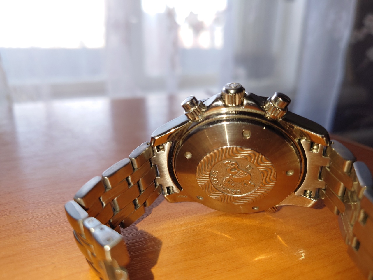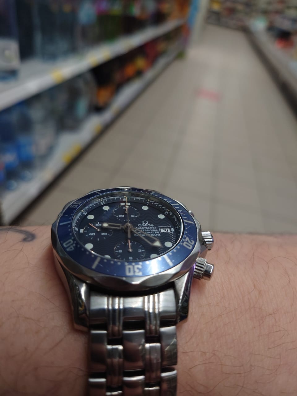 Всем доброго времени суток! Вопрос интересный! На первый взгляд мне не понравилось, что на интересующемся браслете с каждой стороны по 4 основных (несъемных) звена. На оригинальном браслете их по 3. Фото часов сына прилагаю. Плюс хотелось бы взглянуть на застежку часов с надписью SEAMASTER