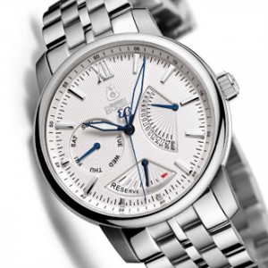 Круглый корпус из полированной нержавеющей стали или 18-каратного розового золота, диаметром 40 мм, водонепроницаемый до 50 метров. Сапфировое стекло с антибликовым покрытием на лицевой стороне корпуса. Задняя его крышка прозрачная. Циферблат гильошированный, антрацитового или белого цвета. Накладные часовые маркеры, стрелки вороненые. Модель оснащена автоматическим механизмом ETA 2892-A2 с дополнительным модулем Soprod 9094. Калибр родированный, отделан круговым зернением и Côtes de Genève, с функциями индикации часов, минут, секунд (центральные стрелки), даты (стрелочный ретроградный указатель на 3 часах), дня недели (круглый стрелочный указатель на 9 часах) и запаса хода (стрелочный указатель на 6 часах). Браслет из нержавеющей стали. Источник: http://www.swisstime.ch/pgs/rwi-pgs-...-idp-2155.html |