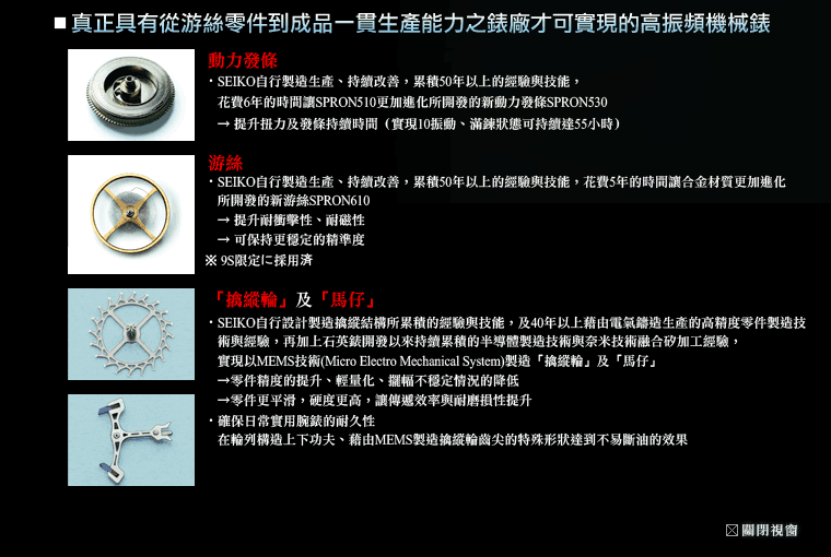 Для изготовления главной пружины применили новый (9s65 и SD), более эластичный сплав – SPRON 510. Он позволил сделать пружину тоньше, но при этом шире и длиннее. Таким образом, удалось добиться значительного увеличения запасаемой энергии при практически неизменных габаритах барабана. http://people.timezone.com/mdisher/s...kosdprimg1.htm http://speed.sii.co.jp/data/file_PRO...LE_IMAGESP.pdf Досталось и спуску: анкерная вилка и анкерное колесо изготовлены по технологии MEMS – той самой «фотомануфактуры», которую так усиленно пиарят швейцарские компании последние 4-5 лет. Seiko использует данную технологию уже 6 лет, правда, вместо популярного у швейцарцев кремния здесь сделали ставку на никель. По словам специалистов Seiko, никель является гораздо более изученным и предсказуемым материалом. К тому же, как металл, он лучше соответствует традициям часового дела (признайтесь, странно слышать это от людей, едва не угробивших традиционный швейцарский часпром?) Никелевые детали как бы выращиваются на специальной пластине, и не требуют последующей механической обработки. Новая технология дает два преимущества: во-первых, поверхность деталей получается более ровной, гладкой, что снижает потери на трение, а во-вторых, она позволяет создавать детали сложной формы, со всевозможными выборками в местах, не влияющих на конструктивную прочность. Это ведет к снижению массы вилки и анкерного колеса, а следом – к значительному уменьшению потерь энергии, так необходимой для достижения трехсуточного запаса хода. Сектор - вольфрам. http://mywatch.ru/netcat_files/Image...n_6-2010_1.jpg http://home.watchprosite.com/img/wat...ge.1847196.jpg 9s85 - spron 530 в пружине, 610 - в волоске баланса + MEMS в спуске Итого: 55 часов\36000 http://www.youtube.com/watch?v=uuBCmdifMtU Так же в сектор юбилейных моделей помещен диск 23к золота. В данной теме даем описания современных механизмов - картинки, характеристики без обсуждения! Year 2001: 9S54 – Handwind movement (SBGW001, SBGW003, SBGW005, SBGW007, SBGW008) Year 2002: 9S56 – Automatic movement with GMT hand (SBGM001, SBGM003, SBGM007, SBGM009) Year 2006: 9S67 – Automatic movement with 72 hrs power reserve and indicator hand (SBGL001, SBGL003) Year 2009: 9S85 – Hi-beat Automatic movement (36000bph) (SBGH001, SBGH003) Year 2010: 9S65 – Automatic movement with 72 hrs power reserve and without power reserve indicator hand (SBGR051, SBGR053, SBGR059) Year 2010: 9S66 – Automatic movement with 72 hrs power reserve and GMT hand (SBGM021, SBGM023) New Standard Established in 1998 Mean daily rate in different positions : -3.0 ~ +5.0 seconds/ day Mean variation : Less than 1.8 seconds/day Maximum variation : Less than 4.0 seconds/day Difference between flat and hanging position : -6.0 ~ +8.0 seconds/day Greatest difference between the mean daily rate and any individual rate : Less than 8.0 seconds/day First variation of rate per 1°C (from 38°C to 8°C): ± 0.5 second/day/°C Second variation of rate per 1°C(from 38°C to 8°C) : ± 5.0 second/day/°C Number of positions: 6 Temperature: 8, 23, 38°C Period: 17 days 9s85 на примере ГС Grand Seiko Automatic Mecahnical Hi-Beat 36000 SBGH001 Вложение 102243 # Movement: 9S85 37J Power Reserve 55Hr. # Accuracy: +5/-3 sec/dayэкземпляры -2+4 The movement measures 28.4 mm in diameter and 6 mm thick. Регулировка в в 6 положениях, термокомпенсация. Вложение 102239 Вложение 102238 Вложение 102241 Вложение 102240 Вложение 102242 Для изготовления механизма применили новый, более эластичный сплав–spron 530 в пружине, 610 - в волоске баланса. Он позволил сделать пружину тоньше, но при этом шире и длиннее. Таким образом, удалось добиться значительного увеличения запасаемой энергии при практически неизменных габаритах барабана. Досталось и спуску: анкерная вилка и анкерное колесо изготовлены по технологии MEMS – той самой «фотомануфактуры», которую так усиленно пиарят швейцарские компании последние 4-5 лет. Seiko использует данную технологию уже 6 лет, правда, вместо популярного у швейцарцев кремния здесь сделали ставку на никель. По слов