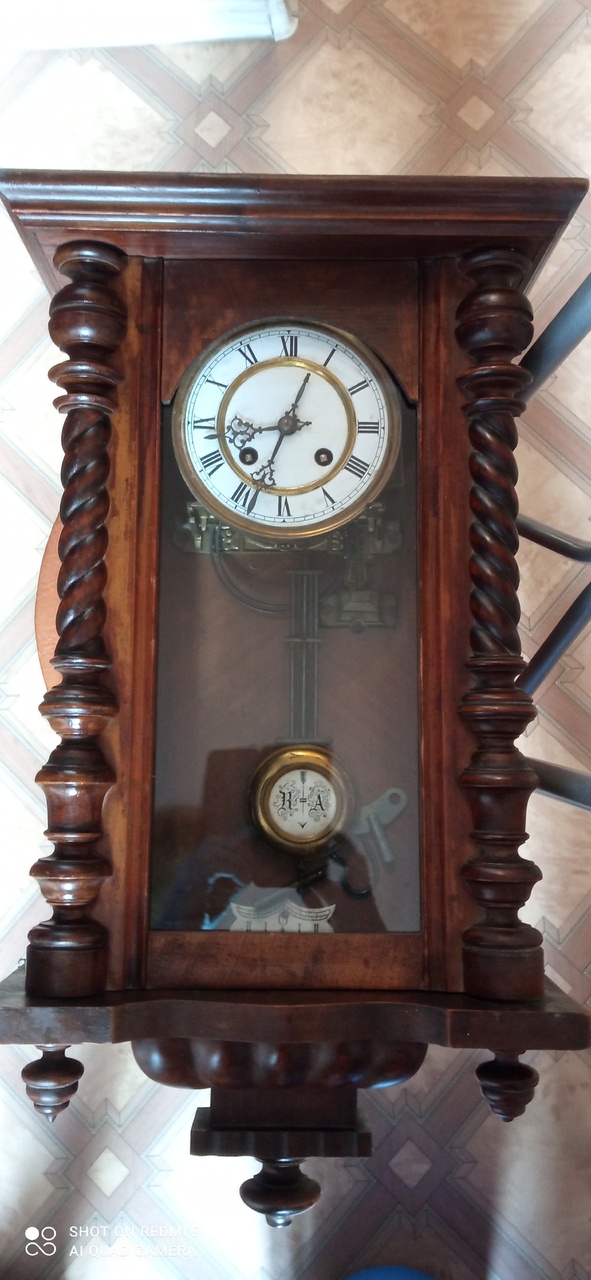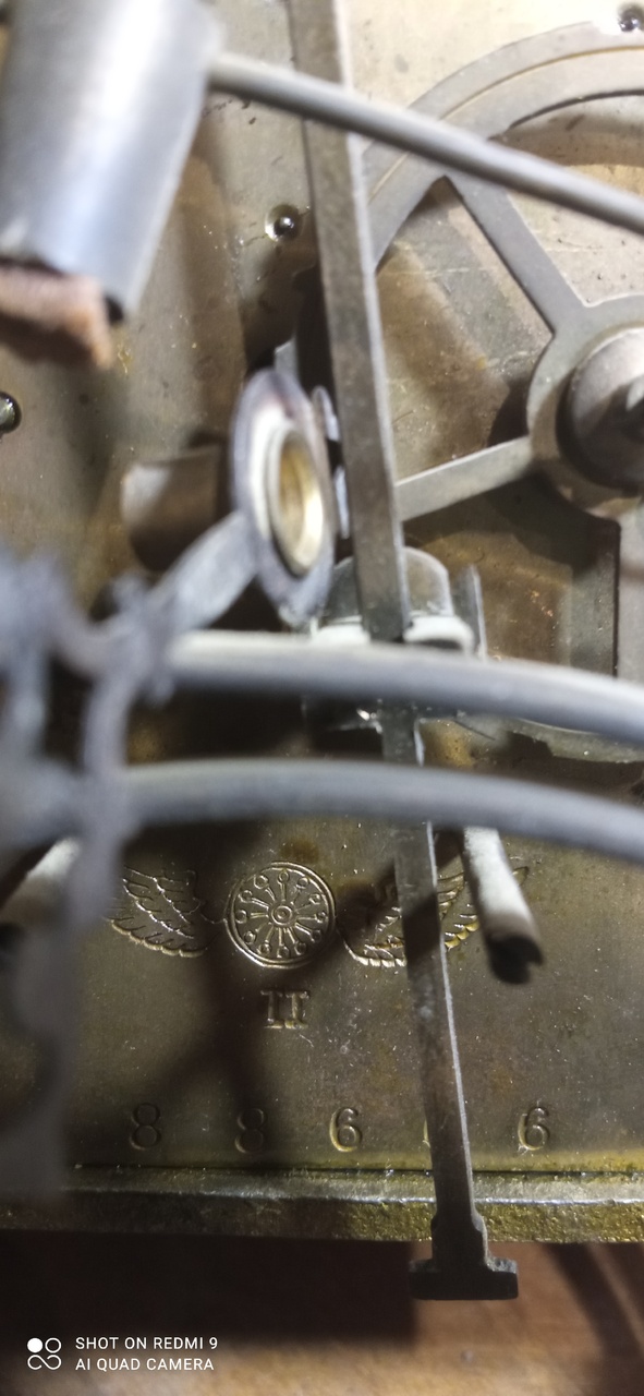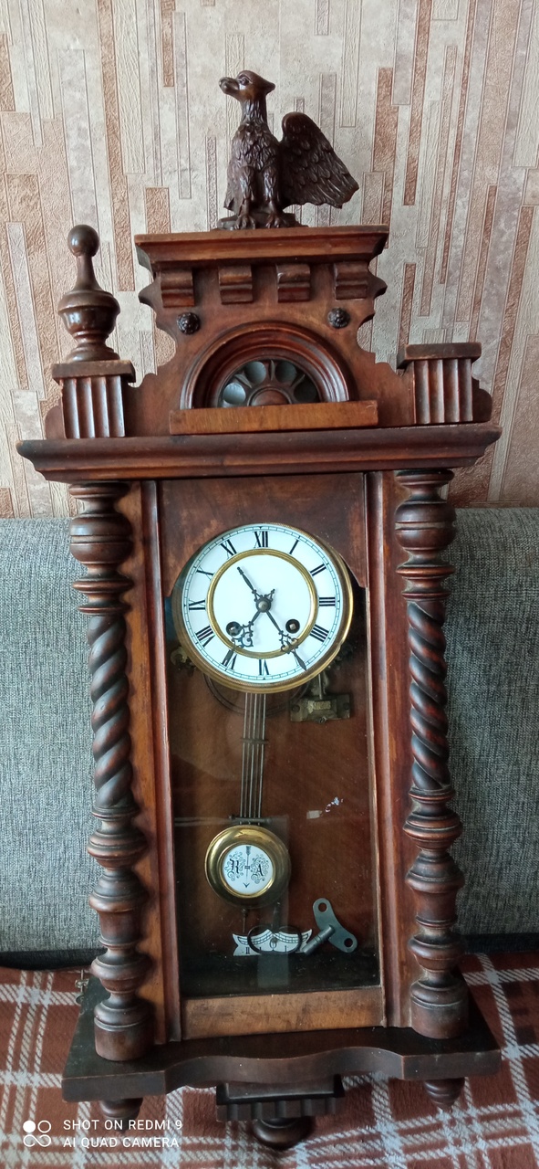 Механизм немецкий, фирма Кинцле. Кто изготовил корпус - неизвестно, циферблат не подписан. Год изготовления механизма - лень смотреть в таблицу. Орла жалко - оторвали ему крыло, может даже красноармейцы. Заставить их работать не сложно, по плечу любому мастеру интерьерных часов, стоимость ремонта будет зависить от состояния механизма, по фото это понять сложно.