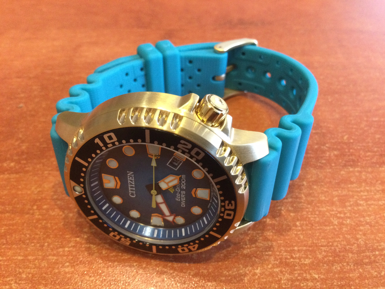 Захотелось мне красных часов. И не так, чтобы с красными элементами, а так, чтобы доминирующие элементы были красными. И, чтобы не фэшн бренд, а нормальный, часовой. И поиски сузились до пары моделей, показавшихся мне наиболее симпатичными. Ими оказались данные часы Ситизен Промастер, и Сан Мартин тунец на механике. Обстоятельства сложились так, что самым разумным выбором стал именно Ситизен – его, по крайней мере, можно было подержать в руках перед предполагаемой покупкой. Чтож, сделан выбор, заказ, - и часы у меня. Часы были упакованы в черную картонную коробочку. В коробочке всё просто – подушечка, инструкция. Чем же понравились мне эти часы? В первую очередь комфортными габаритами корпуса. Миниатюрными часы назвать нельзя, но и из средних они не выбиваются. Корпус имеет приятную обработку «шёлковым» сатинированием. Часы удобно сидят на запястье и не зацепляются за одежду. Все выступающие части заботливо сглажены, кромки притуплены, и даже безель с предусмотренными для большей ухватистости «зубцами» не доставляет неудобств при контакте с тканью одежды. Часы позиционируются как дайверские, но «шайбой» они не выглядят, высота корпуса всего 11,5 мм. Часовые метки и стрелки щедро заполнены люминофорным составом хорошего качества, после зарядки на лампочке, время можно наблюдать всю ночь, до самого утра. Есть ли недостатки у этих часов? На рекламных фото цвет вставки безеля и цвет циферблата очень близки. В реальности это не так. Вставка безеля выполнена из полированного металла(вероятно алюминия) с покрытием, напоминающем ёлочную игрушку с интенсивным блеском свекольно-красного цвета. Циферблат же, не глянцевый,- он имеет текстуру напоминающую виниловую пластинку, что в итоге слегка гасит интенсивность цвета до «свекольного сока с молоком». То есть несовпадение оттенков цвета наблюдается отчетливо. Ещё к недостаткам отнесу немного туговатый безель, и всего на 60 щелчков! Несмотря на ухватистые зубчики, надежно захватить безель можно не в любом месте по окружности, а только в тех местах, где зубчики имеются, - по гладким местам безеля пальцы просто скользят. Итак, теперь основные технические характеристики: диаметр корпуса 44мм, диаметр с заводной головкой 47мм, от ушка до ушка 50мм, расстояние между ушек 20мм. Толщина корпуса 11,5мм. Масса часов 93 грамма. Корпус часов преимущественно круглой формы с мощными ушками и головкой на 4х часах, выполнен из нержавеющей стали. Корпус шёлково сатинирован со всех сторон. Безель часов высокий, сильно покатый, логически продолжает(или завершает) форму корпуса. Безель также шёлково сатинирован по периметру. По краю безеля глубоко фрезерованы зубчики, внутренняя полусферическая часть, которых,- полирована. Зубчики расположены по окружности шестью секторами попадающими как раз между основными минутными обозначениями. В каждом «секторе» по 5 зубчиков. Установленная заподлицо вставка безеля имеет разметку в виде основных минутных значений, выполненную серебристым цветом по красному полю. На отметке соответствующей 12 часам, вставка безеля имеет глубоко утопленную «жемчужину» накрытую тонкой «стеклянной» пластинкой. Сам безель установлен достаточно надежно, хотя имеет небольшую щель между корпусом часов и основанием безеля, что при нажатии на один из краёв безеля даёт ощущение незначительной «пру