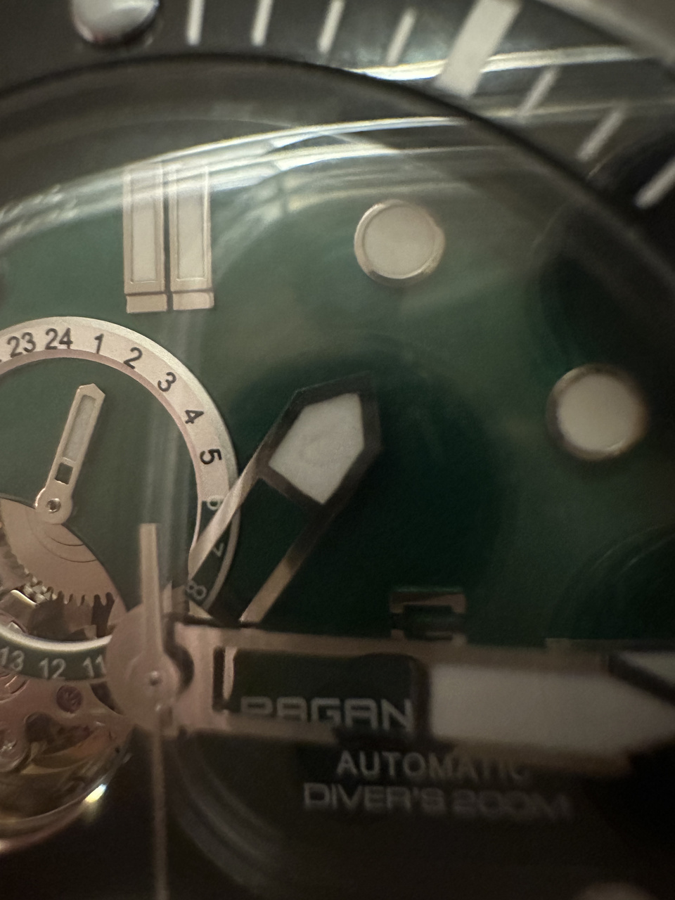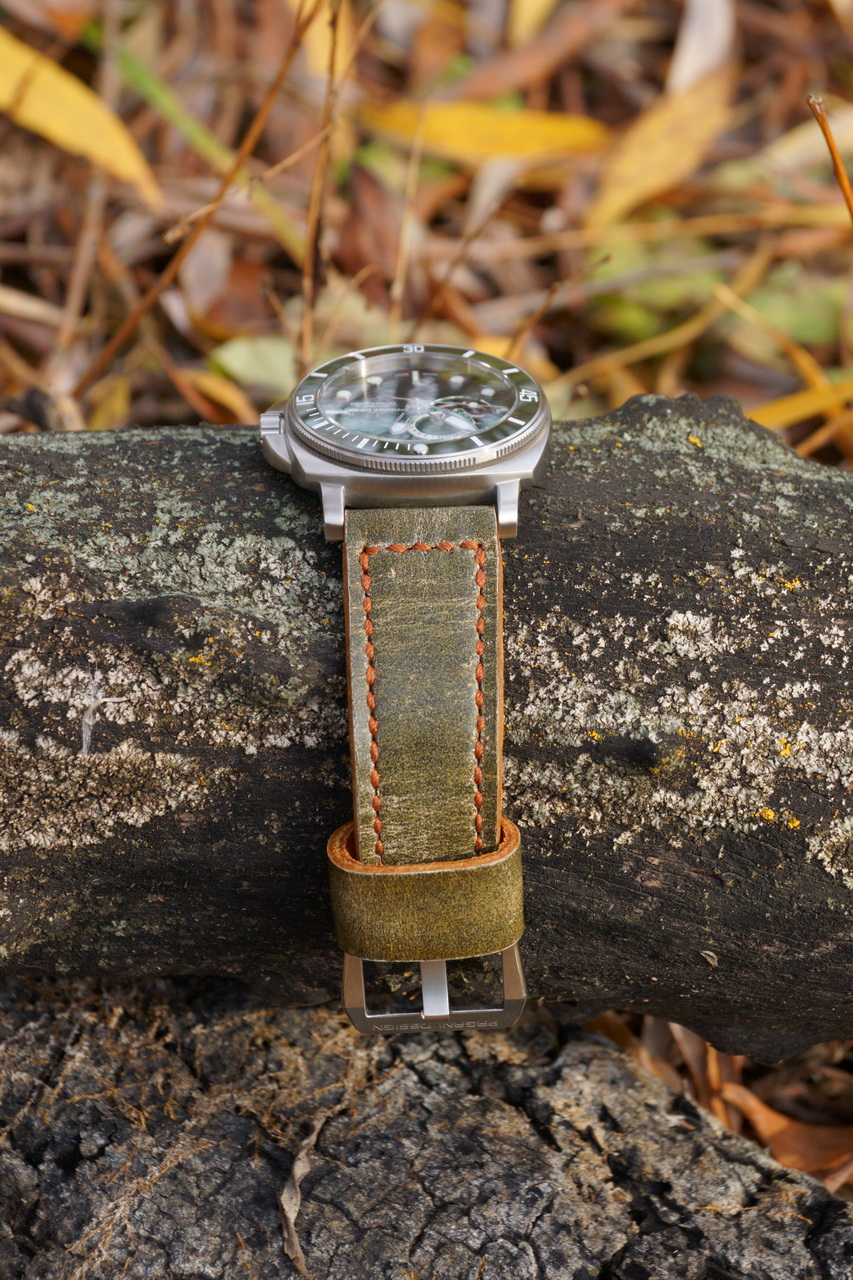 Давно меня терзала идея приобрести часы с открытым балансом на каждый день, чтобы были приличные и не особо дорогие. Среди кандидатов были Orient, Carnival, Pagani Design, остальные либо дороже, либо по формату не подходили. Я стараюсь выбирать часы с легко читаемыми часовыми обозначениями, и такими оказались по результатам размышлений старые добрые Поганцы. Опыт покупок данного бренда уже был, и я не долго сомневался, сделал заказ и через пару недель часики приехали в Питер. Упакованы часики в стандартную картонную коробочку, внутри на поролоновом кусочке сами часы, по стенкам понатыканы: инструкция, гарантийная карта, брендовая бирка. Скромно, экономно и ничего лишнего. Часы мне понравились и в первую очередь внешним видом. Люблю памообразные часы, есть в них некая равновесность и симметрия форм. Данная модель имея схожие с памами внешние очертания корпуса, всё таки хомажем не является. Однако без заимствований не обошлось, - наплывы по обеим сторонам заводной головки явно подсмотрены у ранее вышедшей модели от Сан Мартина. Эти наплывы с некоторого расстояния напоминают механизм блокировки заводной головки у оригинальных Памов, что впрочем смотрится довольно органично. Также порадовало, что вставка безеля изготовлена из керамики, это приятно. В целом обработка корпуса тоже оказалась на приемлемом уровне, по крайней мере острых кромок производитель не оставил. Низкий безель на 120 щелчков, поворачивается с некоторым усилием, но самостоятельно от трения об одежду не сдвигается. Люфтов и покачиваний у безеля нет. Полукупольное сапфировое стекло добавляет винтажности облику часов. И если бы циферблат часов не был бы настолько дерзко зеленым, то ощущение «классики» было бы достигнуто. Есть, конечно и некоторые детали внешнего вида часов, которые можно было бы сделать лучше. Главная претензия к производителю, это не попадание в цвет вставки безеля и цвета циферблата. В общем всё можно назвать зеленым, но, например вставка безеля из керамики имеет ровный теплый зелено-серый цвет, напоминающий окись хрома. Поле циферблата имеет градиентную окраску от интенсивно изумрудного, до темно-травяного, почти черного. Стрелки широкие, это хорошо, но скелетизированные. При свете определить время не представляет труда, однако в темноте заполненные люмом кончики стрелок создают некую «мешанину» световых точек, с часовыми обозначениями различной геометрии, среди которых определить где и что находится, моментально не получится. И, наконец самый заметный недостаток этих часов (хоть и исправляемый) это текстильный ремешок. Он изготовлен из синтетических нитей защитного зеленого цвета, плетения вполне симпатичного, имеет прострочку по обеим сторонам белыми нитками в три ряда. Особенность ремешка в том, что он охотно намокает при контакте с водой, но правда, довольно быстро высыхает. Недостатком ремешка я считаю его способность ворситься, и чем дольше носится ремешок, тем больше ворсинок на нем образуется, - вероятно от контакта с различными поверхностями перетираются нити, - в первую очередь по краям ремешка. Теперь к техническим характеристикам: корпус часов из нержавеющей стали имеет диаметр 43мм, диаметр с заводной головкой 47,5мм, от ушка до ушка 52мм, между ушками 24мм. Толщина около 12мм. Корпус имеет приемлемую обработку сатинированием по всем поверхност