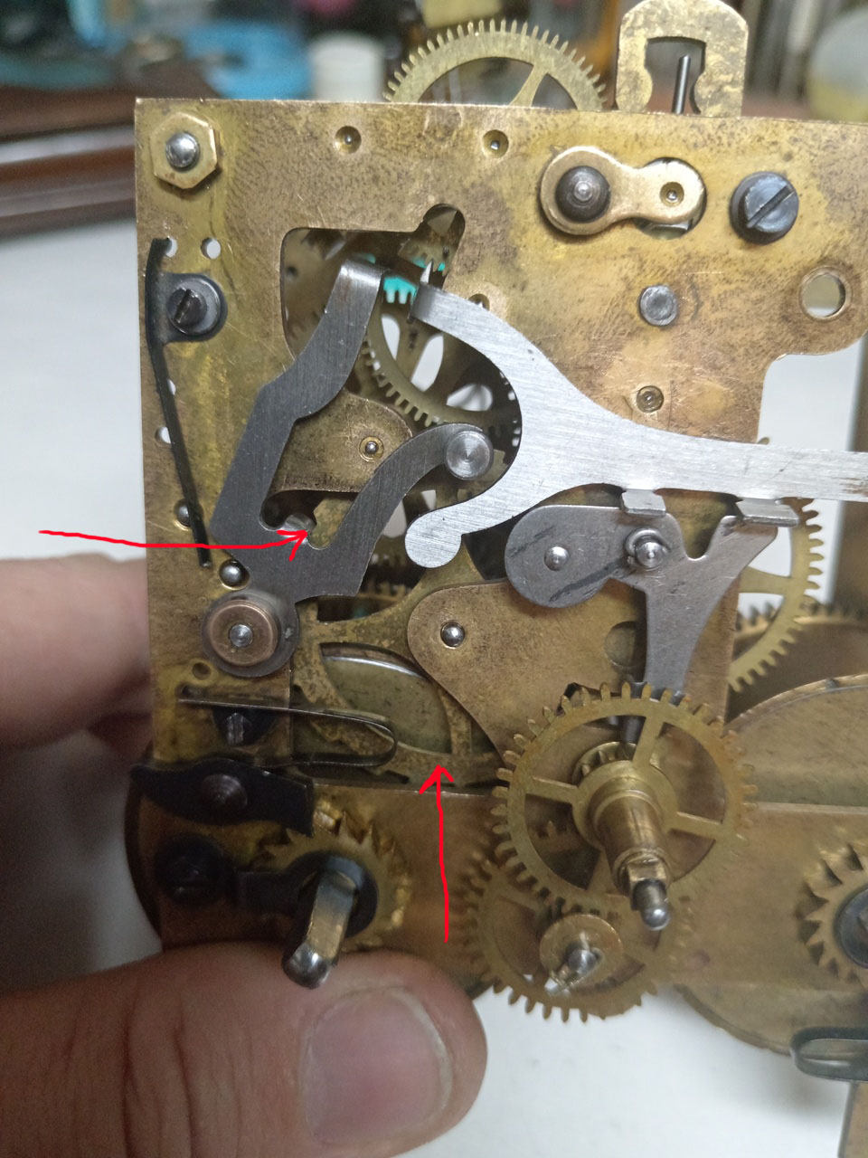 1. Смотрите, что мешает крутится колесам. При поднятии рычага запуска должна произойти разблокировка механизма боя. Далее рычаг запуска должен удерживаться в поднятом состояния вторым рычагом, который связан со счетным механизмом (гребенкой или счетным колесом). При этом механизм боя должен крутится и отбивать удары пока не опустится второй рычаг, потом рычаг запуска и далее опять рычаг запуска должен заблокировать дальнейшее вращение. У Вас я не вижу гребенки или счетного колеса. Обычно, они устанавливаются со стороны циферблата, но тут зарыты где-то внутри.