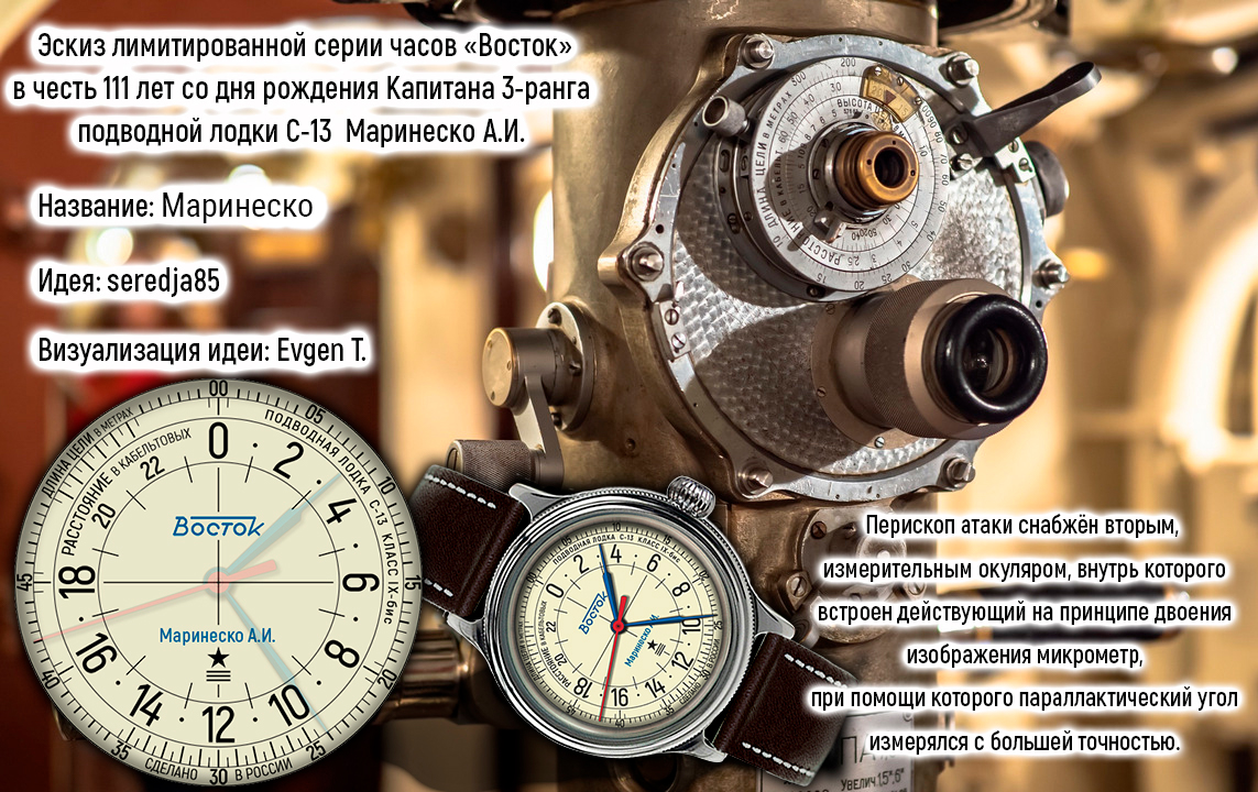 Еще раз внимательно всмотрелся. Зародились некоторые сомнения в пользу варианта №1. На п/л С-13 был только один капитан 3 ранга (Маринеско) И шеврона на цифере, как бы должно быт достаточно, для понимания в честь и память кого часы создаются. Но конечно для этого, нужно знать историю ВОВ и ВМФ. Что для поколения "зумеров", это из другой вселенной. Надпись с фамилией и инициалами, кратким пояснением подвига типа - "Атака века" и изображением рубки С-13, на задней крышке была бы обязательна.