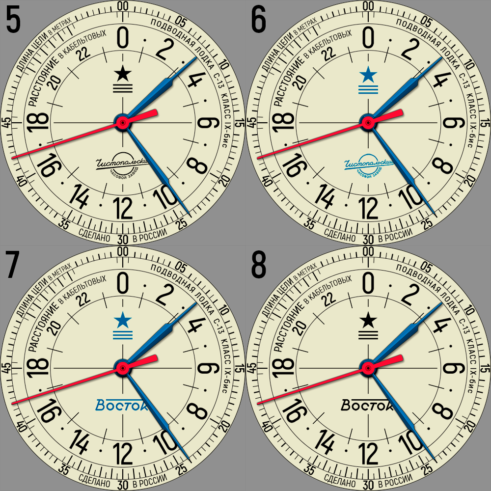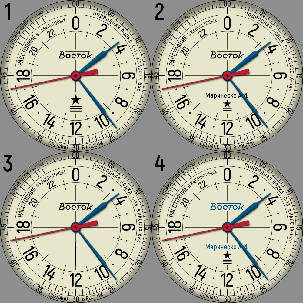 Оказывается, наш проект посвященный Герою Подводнику Маринеско А.И. не оригинален и даже не вторичен. Идея было уже воплощена и даже не единожды. Наверное, чтобы не копировать и не повторятся в дизайне и названии. Надпись "Маринеско А.И." с циферблата убрать (к сожалению). Эмблемы нарукавного шеврона - "Кап. 3 ранга". Будет достаточно, что бы обозначить, кому часы посвящаются (что бы не как у других). Ну и надпись на задней крышке обязательно. В связи с чем... Неуверен, но думаю пересмотреть свое предпочтение по выбору варианта. С №4 на вариант №1 (но это не точно). |