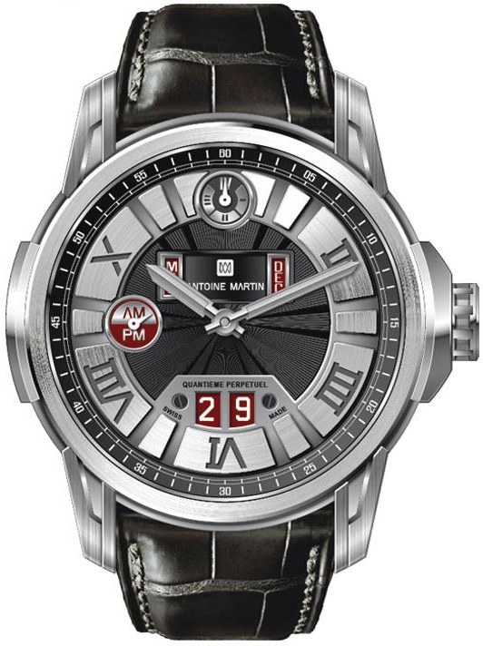 Теперь он основал новый бренд Antoine Martin, причем СEO новой часовой компании стал не сам Мартин Браун, а Бруно Юфер (Bruno Jufer), который имеет большой опыт работы в часовой промышленности (ранее работал в компаниях Maurice Lacroix, Jaquet Droz, Zenith и Carl F. Bucherer). Первой моделью, выпущенной новым брендом, стала Perpetual Calendar, которая будет официально представлена на предстоящей выставке BaselWorld-2011. Круглый корпус из 18-каратного розового или белого золота, а таже из нержавеющей стали с черным DLC-покрытием, диаметром 46 мм. Сапфировое стекло на лицевой стороне корпуса и на его задней крышке. Циферблат объемный, многокомпонентный. Обращают на себя внимание часовая и минутная стрелки мечевидной формы. Модель оснащена мануфактурным механизмом с ручным заводом M 39.001, состоящим из 324 деталей, с большим балансовым колесом диаметром 17,5 мм, частотой 2,5 гц, запасом хода 144 часа (6 дней), функциями индикации часов, минут (центральные секундные стрелки), даты (в двойной апертуре на 6 часах), дня/ночи (круглый стрелочный указатель на 9 часах), високосного года (круглый стрелочный указатель на 12 часах), дня недели (в апертуре на 11 часах), месяца (в апертуре на 13 часах) и запаса хода (стрелочный индикатор на задней стороне калибра). Поставляется на ремешке из крокодиловой кожи. Вложение 108383Вложение 108385Вложение 108384 Источник: http://www.ablogtoread.com/antoine-m...alendar-watch/ |