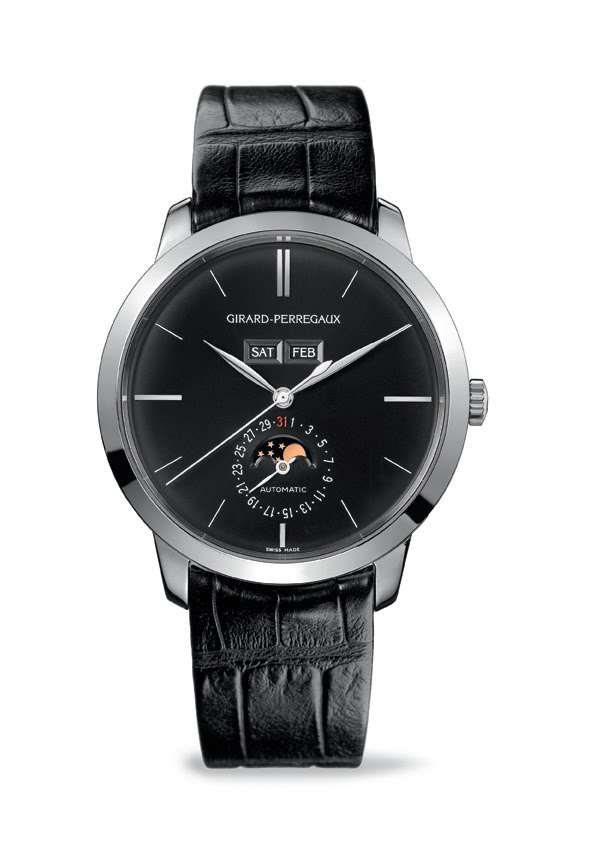 Круглый корпус из полированного белого золота, диаметром 40 мм, водонепроницаемый до 30 метров. Сапфировое стекло на лицевой поверхности корпуса (с антибликовым покрытием) и на его задней крышке. Циферблат черный или опалово-серебристый. Модель оснащена мануфактурным автоматическим механизмом Girard-Perregaux GP033M0, диаметром 11 ½''' линий, на 27 камнях, с балансовой частотой 28800 полуколебаний в час (4 гц), запасом хода минимум 46 часов, функциями индикации часов, минут, секунд (центральные стрелки), даты (круглый стрелочный указатель на 6 часах), дня недели (в апертуре на 11 часах), месяца (в апертуре на 13 часах) и фаз Луны (на 6 часах). Черный ремешок из кожи аллигатора с застежкой из белого золота. Источник: http://www.horozima.com/2011/03/gira...lendar-in.html |