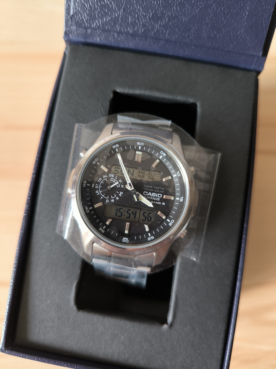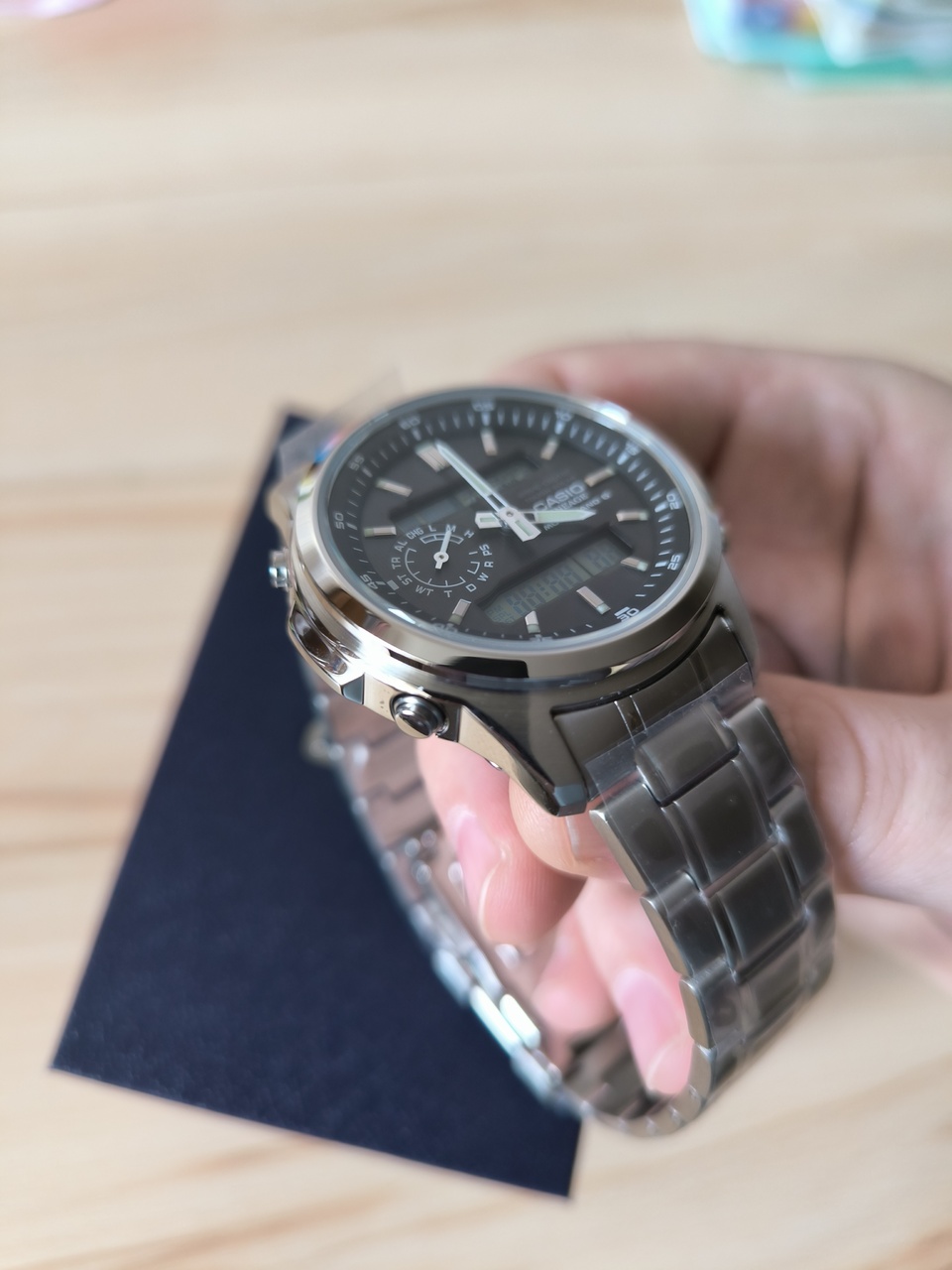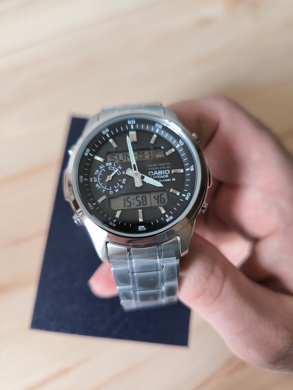Пол: мужские Год покупки: 2025 Новые часы, состояние: N (новые в пленках) http://forum.watch.ru/images/market-question.png Цена: 25 000 руб. (продажа) Коробка: есть Документы: есть Часы с большой буквы, настоящий Японский инструмент, без преувеличения! Часы абсолютно новые, браслет в плёнках, с корпуса снял для фото. Куплены в Японии в этом году, в крупнейшей сети магазинов часов. Часы свежие, произведены 6 июня 2024 года, согласно серийному номеру на крышке часов (187-ой день 2024г.), на витринах не стояли, коробка была запаяна в заводскую пленку. Полный комплект - коробка, бирки, инструкция. Данная модель производится исключительно для внутреннего рынка Японии, аналогов на экспорт не производилось и официально не поставлялось. Моя любимая модель из линейки Lineage, сам носил такие же три года. Часы изготовлены полностью из нержавеющей стали, классический японский дизайн, объемный, очень красивый и информативный циферблат с двойной индикацией (цифровая и стрелочная), прекрасная читаемость всех показаний, широчайший функционал, и высокое качество Casio! Отличительная особенность модели - гильошированный циферблат, гильоше в виде вертикальных полос нанесено на саму солнечную панель, что редкость даже на гораздо более дорогих часах. Метки не просто накладные металлические, на поверхности каждой сделаны микро насечки, что улучшает читаемость и добавляет игры света. Циферблат максимально заполнен, но не перегружен, все элементы функциональны и информативны. Кнопки в часах нажимаются мягко, все переключения и настройки интуитивны. Читаемость так же превосходная, индикация времени четкая, контрастная, на стрелки нанесена белая краска и люминофор, что усиливает контраст с циферблатом. Модуль часов отдельная тема для обзора. По моему мнению это лучший модуль у Casio. Два дисплея с отображением дня недели, секунд и текущего времени или даты. На девяти часах расположен индикатор уровня заряда аккумулятора и режима работы часов. Часами очень удобно пользоваться в повседневке, переключать режимы, таймер, секундомер, текущее время. Есть возможность выбора часового пояса Москва, которого нет в большинстве других моделей, что облегчает настройку радиосинхронизации. В Туле синхронизация прошла в первую же ночь, в коробке, в шкафу. Стрелки автоматически синхронизируются с цифровым временем. Автоматический переход на второй часовой пояс по одному нажатию. По водозащите, 50 метров или 5 Атм. С 50м от Casio можно смело купаться, но без ныряний и прыжков. В часах уставлена солнечная батарея, вам не нужно менять батарейку, часы заряжаются от солнечного света. Имеется интеллектуальный режим энергосбережения, в зависимости от освещенности, т.е. каждую ночь часы засыпают и просыпаются с вами, включая и выключая дисплеи автоматически. Сами засыпают, если вы ими долго не пользуетесь и оставили в темноте, переводя стрелки в режим ожидания. Срок службы аккумулятора не менее 10 лет. Автоматическая светодиодная подсветка, активируется в зависимости от окружающей освещенности, при повороте руки. Основные функции: мировое время с быстрым переключением стрелок в выбранный пояс, секундомер, таймер, будильники, сигнал начала часа. Сигнал достаточно громкий. Размеры (Высота×Ширина×Толщина): 46.5×42.8×11.6мм, масса: 127г. Отличный вариант для тех кому нужны надежные, функциональные и красивые часы на каждый день за не
