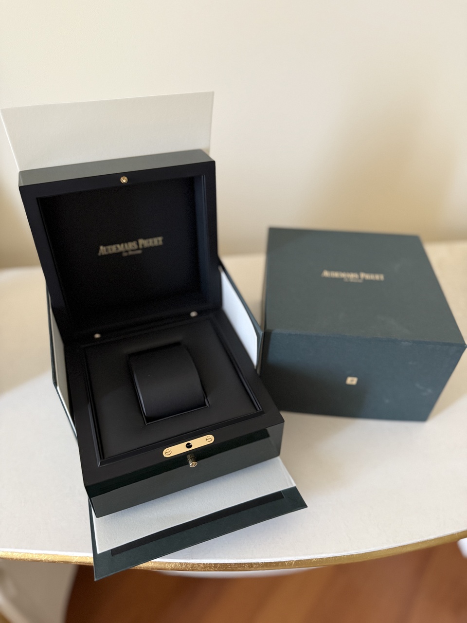 В продаже коробка audemars piguet - оригинал. Состояние как у новой (просто пролежала в шкафу). На картоне есть небольшие потертости - можно обычным канцелярским ластиком убрать.