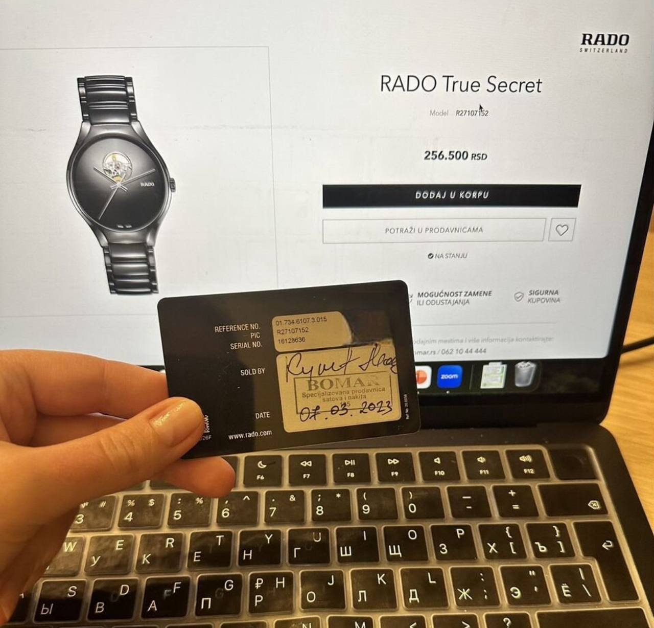Пол: унисекс Год покупки: 2023 БУ часы, состояние: AAA (идеальное) http://forum.watch.ru/images/market-question.png Полировка: нет Цена: 170 000 руб. (продажа) Коробка: есть Документы: есть Купила в марте 2023 года в сербском бутике BOMAR за 254.000 динар (по курсу —около 230.000 рублей), в идеальном состоянии — ни единой царапины. Носила буквально несколько раз. Хранились бережно в комплекте с оригинальной коробочкой-чехлом. Часы идут с сертификатом соответствия и международной гарантией на 2 года. С минималистичным циферблатом, они подойдут как для делового, так и для повседневного или вечернего образа. Пружинный калибр ЕТА C07.631 с автоподзаводом обеспечивает запас хода до 80 часов. Сквозь прозрачное окошко можно наблюдать за плавным движением шестерёнок с узором «жемчужное зернение». Швейцарское качество, высокотехнологичная керамика для удобства ношения, сапфировое стекло с антибликовым покрытием и водостойкость WR 50 — всё это делает RADO True Secret отличным выбором для подарка или личного использования. В Москве аналогичные модели продаются почти за 300,000 рублей в официальных бутиках! (прикрепляю скрины) Пишите, отвечу на все вопросы! Могу прислать видео) Готова доставить в любую точку Москвы :) Унисекс – универсальная модель часов. Керамика – корпус из высокотехнологичной керамики с устойчивостью к появлению царапин, легкостью. Он теплее стального, гипоаллергенен. Механические – установлен швейцарский механизм. Разработан, произведен и собран в Швейцарии. Автоподзавод – часы заводятся сами во время ношения на руке. Браслет – браслет из металла или аналогичных не эластичных материалов. Водонепроницаемость 50 м – часы защищены от случайных брызг воды, дождя и кратковременного погружения в воду, без перепада температур. Сапфировое – стекло из сапфира с устойчивостью к царапинам, антибликовым покрытием. Вложение 3882528 Вложение 3882529 Вложение 3882530 Вложение 3882531 Вложение 3882532 Вложение 3882533 Вложение 3882534 |