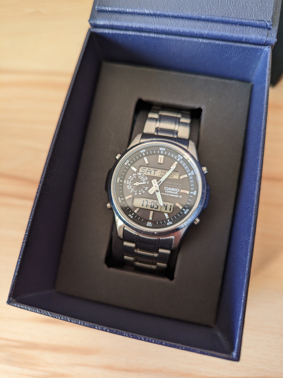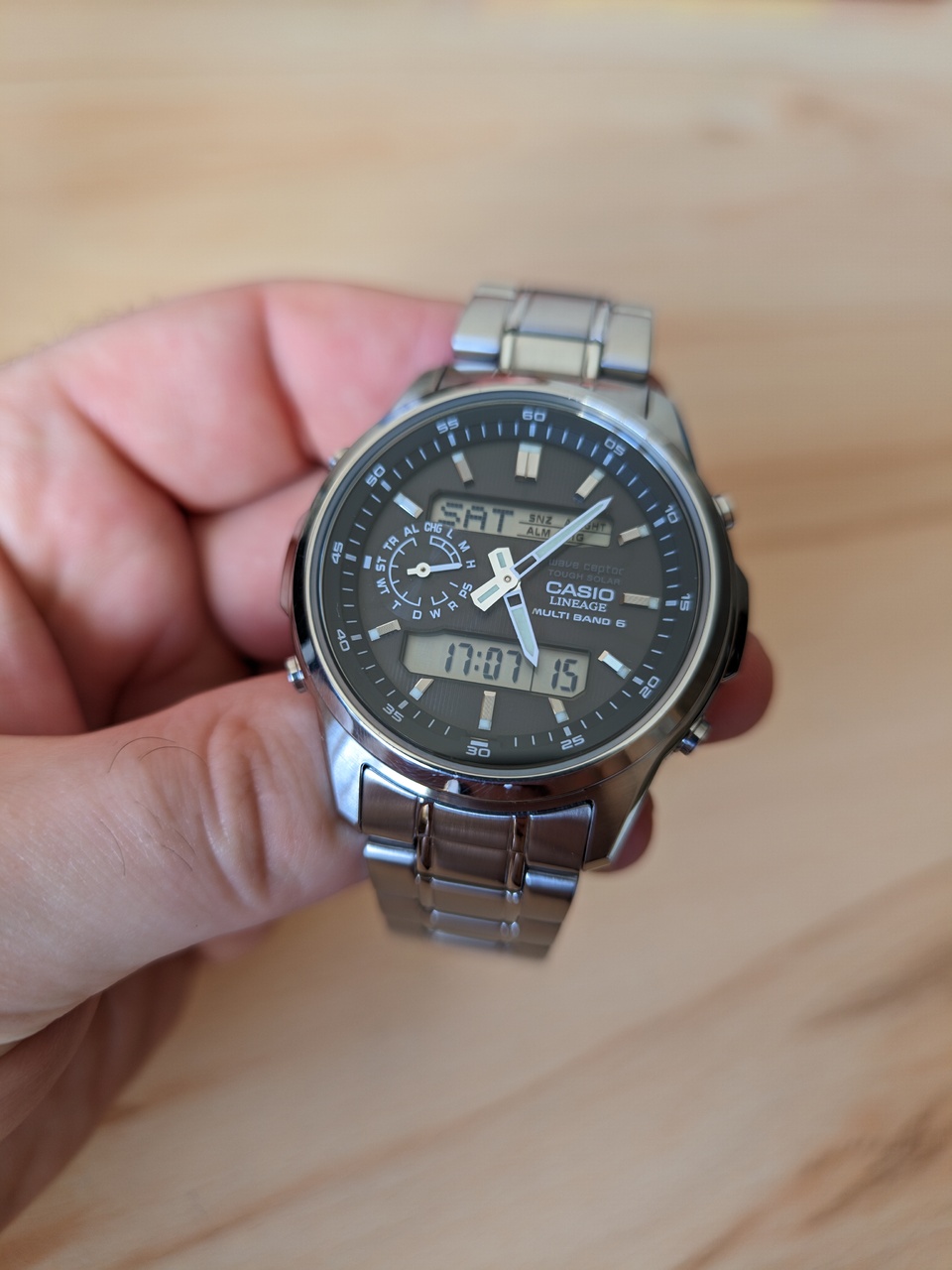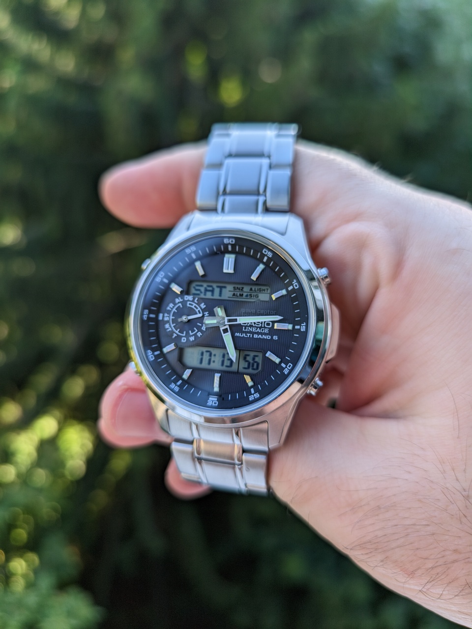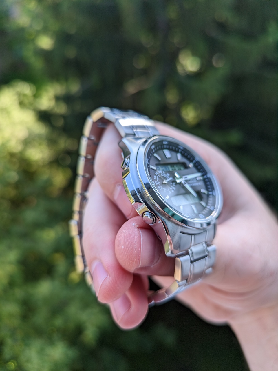 Пол: мужские Год покупки: 2024 БУ часы, состояние: AA (отличное) http://forum.watch.ru/images/market-question.png Полировка: нет Цена: 18 000 руб. (продажа) Коробка: есть Документы: есть Часы с большой буквы, настоящий Японский инструмент, без преувеличения! Куплены в Японии в июне 2024 года, в крупнейшей сети магазинов часов. Часы свежие, произведены 3 октября 2023 года, согласно серийному номеру на крышке часов (276-ой день 2023г.), на витринах не стояли, коробка была запаяна в заводскую пленку. Есть мелкие царапины и небольшие потертости на браслете, всё видно на фото и видео, даже излишне. На стекле ни одной царапины нет. Браслет полной длины. Аккумулятор полностью заряжен до максимального уровня. Срок службы аккумулятора не менее 10 лет. Полный комплект - коробка, бирки. Данная модель производится исключительно для внутреннего рынка Японии, аналогов на экспорт не производилось и официально не поставлялось. Часы изготовлены полностью из нержавеющей стали, классический японский дизайн, объемный, очень красивый и информативный циферблат с двойной индикацией (цифровая и стрелочная), прекрасная читаемость всех показаний, широчайший функционал, и высокое качество Casio! Отличительная особенность модели - гильошированный циферблат, гильоше в виде вертикальных полос нанесено на саму солнечную панель, что редкость даже на гораздо более дорогих часах. Метки не просто накладные металлические, на поверхности каждой сделаны микро насечки, что улучшает читаемость и добавляет игры света. Циферблат максимально заполнен, но не перегружен, все элементы функциональны и информативны. Кнопки в часах нажимаются мягко, все переключения и настройки интуитивны. Читаемость так же превосходная, индикация времени четкая, контрастная, на стрелки нанесена белая краска и люминофор, что усиливает контраст с циферблатом. Модуль часов отдельная тема для обзора. По моему мнению это лучший модуль у Casio. Два дисплея с отображением дня недели, секунд и текущего времени или даты. На девяти часах расположен индикатор уровня заряда аккумулятора и режима работы часов. Часами очень удобно пользоваться в повседневке, переключать режимы, таймер, секундомер, текущее время. Есть возможность выбора часового пояса Москва, которого нет в большинстве других моделей, что облегчает настройку радиосинхронизации. У меня в Туле синхронизация почти каждую ночь проходила, за редким исключением, часы лежали в коробке, в шкафу. Стрелки автоматически синхронизируются с цифровым временем. Автоматический переход на второй часовой пояс по одному нажатию. По водозащите, 50 метров или 5 Атм. С 50м от Casio можно смело купаться, но без ныряний и прыжков. В часах уставлена солнечная батарея, вам не нужно менять батарейку, часы заряжаются от солнечного света. Имеется интеллектуальный режим энергосбережения, в зависимости от освещенности, т.е. каждую ночь часы засыпают и просыпаются с вами, включая и выключая дисплеи автоматически. Сами засыпают, если вы ими долго не пользуетесь и оставили в темноте, переводя стрелки в режим ожидания. Срок службы аккумулятора не менее 10 лет. Автоматическая светодиодная подсветка, активируется в зависимости от окружающей освещенности, при повороте руки. Основные функции: мировое время с быстрым переключением стрелок в выбранный пояс, секундомер, таймер, будильники, сигнал начала часа. Сигнал достат