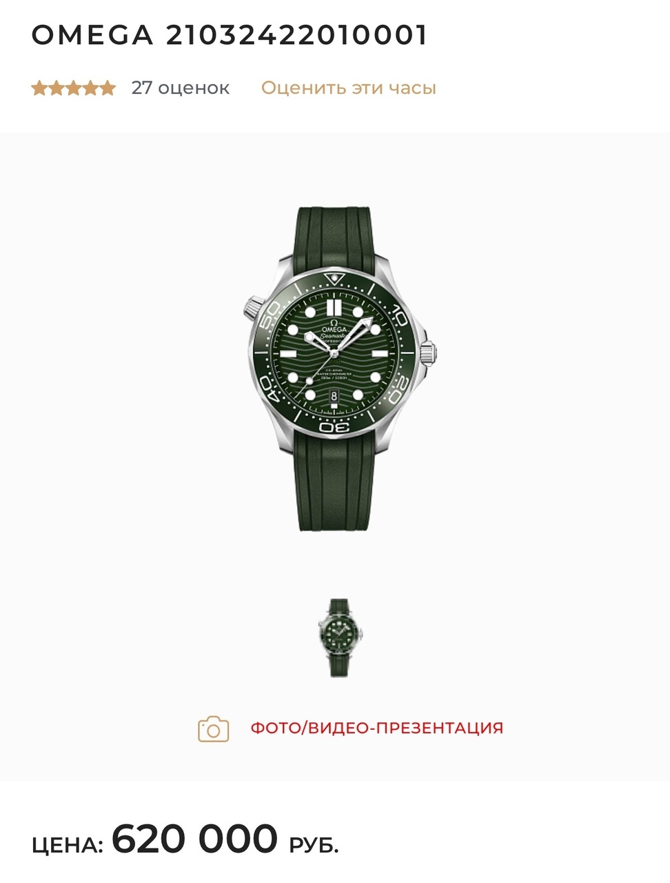 Пол: мужские Год покупки: не указано Новые часы, состояние: N (новые в пленках) http://forum.watch.ru/images/market-question.png Цена: 5 900 USD (продажа) Коробка: есть Документы: есть ПРОДАЮ OMEGA SEAMASTER DIVER 300M CO‑AXIAL MASTER CHRONOMETER 42MM REFERENCE: 210.32.42.20.10.001 МАТЕРИАЛ КОРПУСА: нержавеющая сталь БЕЗЕЛЬ: однонаправленный из керамики с дайверской шкалой из белой эмали ДИАМЕТР КОРПУСА: 42 мм МЕХАНИЗМ: механический с автоподзаводом ( calibre 8800, запас хода 55 часов ), дата, сертификат COSC, METAS (антимагнитные) ЦИФЕРБЛАТ: зеленая керамика с люминесцентными стрелками и метками СТЕКЛО: выпуклое сапфировое с антибликовым покрытием РЕМЕНЬ / БРАСЛЕТ: зеленый каучук с классической стальной пряжкой ВОДОЗАЩИТА: 300 метров RETAIL В РФ: 620.000 руб. Вложение 3902454 СКИДКА: 22% НАША ЦЕНА: 5.900 $ В НАЛИЧИИ В МОСКВЕ ( ДОСТАВКА КУРЬЕРОМ ПО МОСКВЕ И ВСЕЙ ТЕРРИТОРИИ РОССИИ + БЕЛОРУССИЯ И КАЗАХСТАН ) ДЛЯ УДОБСТВА, СРАЗУ УКАЗАЛ МИНИМАЛЬНУЮ ЦЕНУ. ( БЕЗ ТОРГА ) ОПЛАТА В $ ИЛИ РУБЛЯМИ ПО МИНИМАЛЬНОМУ КУРСУ ПРОДАЖИ НАЛИЧНЫХ $ |