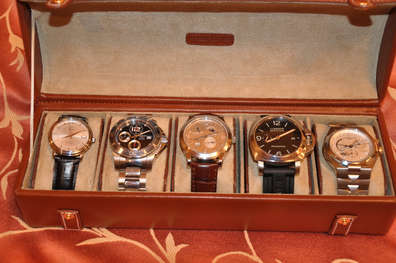 Неожиданно для себя вспомнил, что друзья, зная о моей пагубной привычке:), подарили больше года назад кейс для хранения 5-ти часов. Как оказалось, у меня есть чем его заполнить. И вот, часы, сиротливо лежащие до этого момента врозь и напоминающие вырванные зубы, сразу встали в ровный ряд, каждый заняв свое место и превратились в пятизубую улыбку.:D