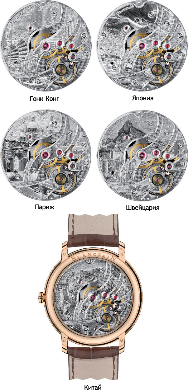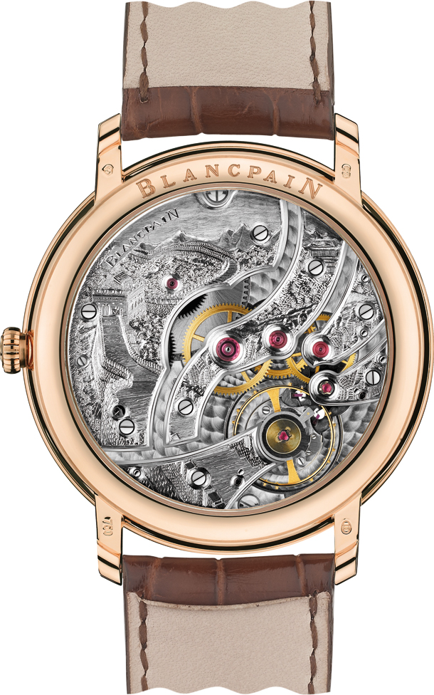 Villeret Grande Décoration – это блистательные часы, красота которых выходит за рамки их изысканных линий. Сквозь прозрачную заднюю крышку корпуса взгляду открывается ошеломляющий вид исключительного оформления механизма, созданного вручную мастерами гравировки компании Blancpain. Благодаря чуть более увеличенным мостам калибра 15B, мастера мануфактуры le Brassus дали волю своему таланту при создании оригинального декора каждой из пяти моделей, которые предстанут в этом году перед гостями выставки. Каждый сюжет – это уникальное художественное произведение, отражающее пейзажи и достопримечательности той или иной страны. Быть представленными на модели часов в начале этого года удостоились Швейцария, Франция, Япония, Китай и Гонконг. В течение всего 2011 года мастера гравировки Blancpain будут предлагать различные вариации, каждая из которых будет поистине единственная в своем роде.
