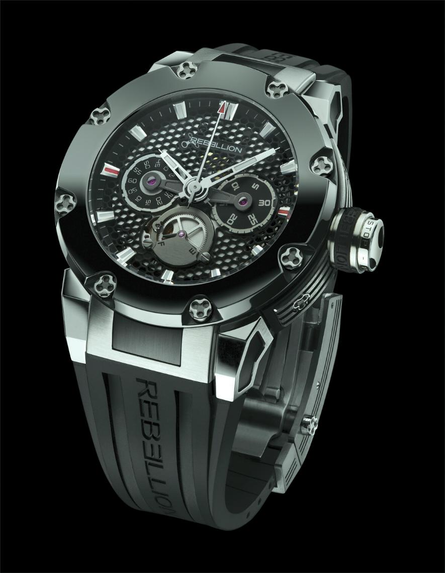 Циферблат черный сотовый с накладными часовыми индексами, покрытыми, как и часовая и минутная стрелки, с белым люминесцентным покрытием. Модель оснащена швейцарским автоматическим механизмом Rebellion RE-1 на 30 камнях, с балансовой частотой 28800 полуколебаний в час, запасом хода 50 часов, функциями индикации часов, минут (центральные стрелки), секунд (на боковом циферблате на 9 часах), запаса хода (указатель на 6 часах), а также с однокнопочным хронографом (центральная секундная стрелка, 30-минутный счетчик на 3 часах). Черный каучуковый ремешок с раскладной застежкой из нержавеющей стали. Источник: http://forums.timezone.com/index.php...=5608562&rid=0 |