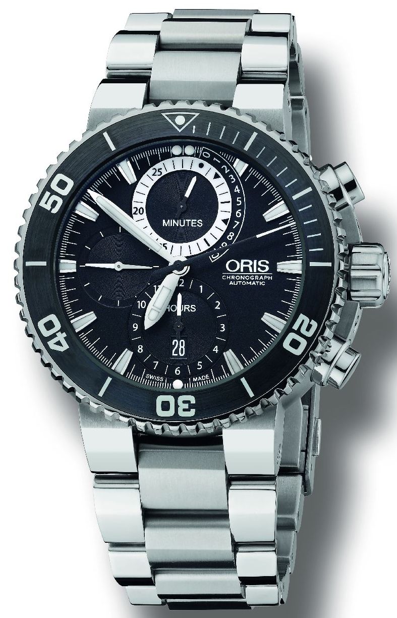 Круглый корпус из титана, диаметром 46 мм, водонепроницаемый до 500 метров. Дайверский керамический безель с индексами на шкале, покрытыми люминесцентным составом Superluminova. На задней крышке корпуса имеется изображение ныряльщика. Автоматический гелиевый клапан находится на 9 часах. Черный циферблат с часовыми маркерами, часовой и минутной стрелками, покрытыми Superluminova. Модель оснащена автоматическим механизмом ETA 7750 с красным ротором и функциями индикации часов, минут (центральные стрелки), секунд (на боковом циферблате на 9 часах), а также с хронографом (центральная секундная стрелка, 12-часовый счетчик на 6 часах, 30-минутный счетчик на 12 часах). Интересно, что 2-я минута на 30-минутном счетчике хронографа отмечена треугольником, что символизирует персональный рекорд Карлоса Косте в динамическом плавании под водой без дыхания, составляющий 2:30 минут. А треугольник на 7 минутах указывает на рекордное время задержки дыхания (7:30 минут) выдающегося фридрайвера при статическом погружении в воду. Поставляется на титановом браслете с регулируемой застежкой, а также с каучуковым ремешком (в комплекте). Лимитированный выпуск 2000 экземпляров. Вложение 118236 Источник: http://www.horozima.com/2011/04/oris...urce=BP_recent |