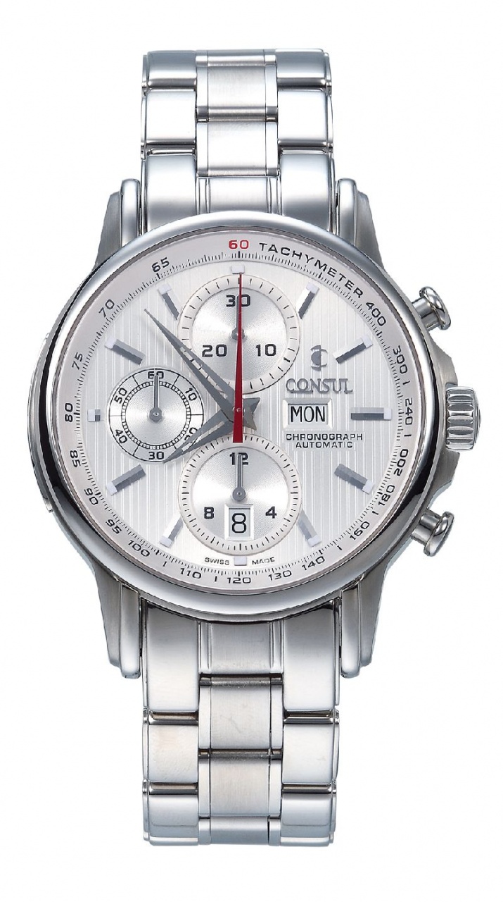 Круглый корпус из полированной нержавеющей стали, диаметром 42 мм, водонепроницаемый до 30 метров. Завинчивающаяся защищенная заводная головка. Выпуклое сапфировое стекло на лицевой стороне корпуса и на его задней завинчивающейся крышке. Циферблат серебристый с накладными часовыми маркерами. На фланце размещена тахиметрическая шкала. Модель оснащена швейцарским автоматическим механизмом ETA 7750, с запасом хода 43 часа, функциями индикации часов, минут (центральные стрелки), секунд (на боковом циферблате на 9 часах), даты (в апертуре на 6 часах), дня недели (в апертуре на 3 часах), а также с хронографом (красная центральная секундная стрелка, 30-минутный счетчик на 12 часах, 12-часовый счетчик на 6 часах). Браслет из нержавеющей стали или кожаный ремешок с раскладной застежкой-бабочкой. Источник: http://www.horozima.com/2011/04/cons...urce=BP_recent |