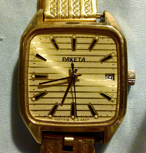 Здравствуйте. Мне сегодня тоже попалась такая Ракета. Состояние просто КЛАСС. Вот подскажите, может ли она быть золотая. Сравниваю с позолоченными часами, отличается и что интересно, на корпусе нет клейма AU, как обычно на позолоченных.