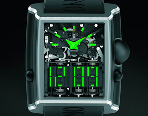 Цифровой дисплей является механическим, цифровые сегменты формируются при помощи вращающихся трубочек, отображая минуты и часы при помощи подвижных микросегментов. Временная информация показывается при помощи массива из 23 горизонтальных и вертикальных микросегментов. Вертикальные сегменты высотой 9 мм весят почти 25 мг, в то время как горизонтальные высотой 2,90 мм весят всего 10 мг. Сегменты имеют четыре стороны: две противоположные видимые стороны оснащены окрашенными полосками, а на двух других сторонах их нет. Визуальное отображение хода времени достигается вращением требуемых сегментов относительно друг друга на 90° . Эти водостойкие часы производятся в корпусе четырех цветов красного золота, титанового с золотом, титанового с платиной и титанового с резиновой отделкой. Источник: http://news.1k.by/home/Pervyie_v_mir...leem-1136.html |