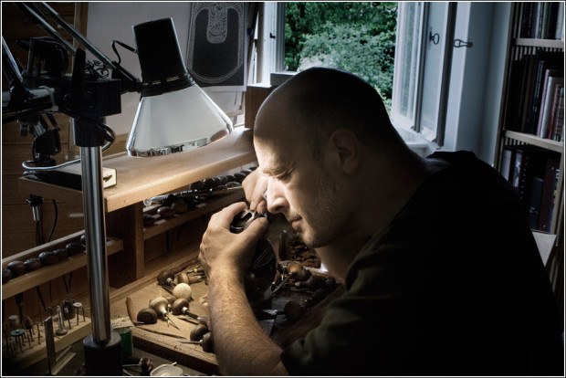 Это визуально ошеломляющие часы с корпусом из белого золота отличаются великолепной художественной ручной гравировкой, выполненной мастером-гравером Jean-Vincent Huguenin (на фото внизу). Название модели "Phoenix" ("Феникс") происходит из древнегреческой мифологии и является символом вечной жизни, возрождающейся из пепла.