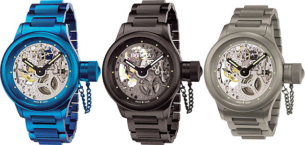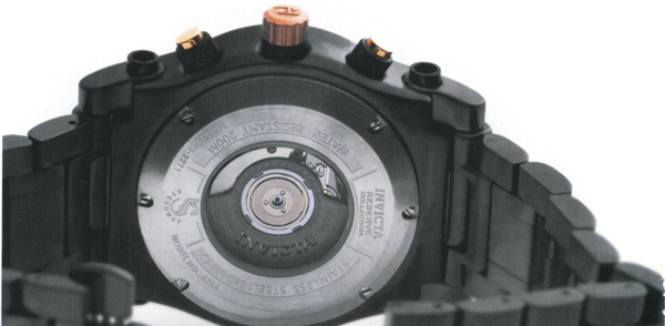 Invicta Reserve Speedway Automatic Chrono Название модели звучит как лозунг: Reserve speedway!, который можно перевести как «Обзаведись своим скоростным участком!». Призыв к тем, кто обожает скорость. Да и сами часы получили автоспортивную внешность, особенно благодаря мощному 24-миллиметровому браслету с крупными литыми звеньями, который напоминает мотоциклетную цепь. Крепится он к корпусу четырьмя выдающимися на Змм в стороны винтами, которые отворачиваются автомобильным 6-гранным ключом. Впрочем, Invicta Reserve Speedway чем-то похожа и на оружие. Внушительный стальной корпус окрашен в антрацитовый цвет. Материал корпуса напоминает вороненую сталь, из которой обычно делают оружие, но на самом деле это высоколегированный сплав L316 с черным покрытием методом ионного напыления. И поверхность корпуса истинно оружейная не матовая, но и не полированная. Даже черно-перламутровый циферблат здесь напоминает камуфляж. А между тем он многоуровневый: первый слой перламутр, второй золотые колодцы счетчиков и стрелки, на третьем расположены светящиеся метки, на четвертом их дублеры на фланце и, наконец, на пятом шкала. Стрелки толстые золотые. Минутная имеет 4 люминесцентные точки, которые напоминают пулевые отверстия, часовая три. На одном кончике секундной стрелки окрашенный люминесцентом наконечник, а на коротком эмблема. Прекрасно подойдет этот хронограф и профессиональным дайверам. Водонепроницаемость превосходная до 200 метров. Ободок оснащен трещоткой с шагом 1 щелчок = 1 минута. Он вращается в одну сторону, имеет 60-минутную разметку и светящиеся 6 точек, которые повышают высоту корпуса еще на полмиллиметра. Кнопки хронографа закручиваются и имеют золотые торцы. На стальном ободе задней крышки, которая имеет сапфировое окно и крепится 6 винтами, сквозь окно можно рассмотреть, что сектор автоподзавода имеет тот же цвет, что и корпус часов, а мосты и платины механизма декорированы тонкими полосками. В корпусе установлен автоматический хронограф ЕТА 2894 с весьма любопытным (характерным для знаменитого высокочастотного зенитовского калибра El Primero) расположением дополнительных циферблатов: 30-минутный и 12-часовой счетчики соответственно на отметках «9 и 6 часов», боковые секунды на отметке «3 часа», а дата на «4.30». В общем, этот прибор подойдет для любого настоящего мужчины, будь то стритрейсер, охотник или дайвер. Ведь не зря же название швейцарской марки Invicta из города Ла-Шо-де-Фон произошло от слова Invincible, что означает «непобедимый». Основанная в 1837 году компания Invicta сегодня считается одной из самых быстрорастущих часовых групп Швейцарии. Кроме титульных часов Invicta Group выпускает б самых разнообразных марок на собственной мануфактуре под названием Technica Swiss Ebauche. Invicta Reserve Speedway Automatic Chrono Ref.: 4386 Корпус: 45 мм, высота 14 мм, из хирургической стали 316L с черным ионным покрытием, сапфировое стекло и задняя крышка на 6 винтах с сапфировым окном, вращающийся позолоченный безель, заводная головка и кнопки хронографа завинчиваются, WR 200 м Циферблат: перламутровый, многоуровневый, стрелки и метки позолочены и покрыты люминесцентным составом Trinite Механизм: автоматический хронограф ЕТА 2894, частота 28 800 пк/час, запас хода 44 часа, мосты и платины декорированы вручную Функции: часы, минуты, боковые секунды, хронограф с центральной стрелкой, 30-минутным и 12-часовым счетчиком, календарь-дата Брас