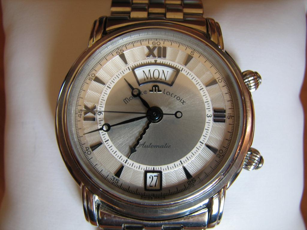 Продаются Maurice Lacroix ML20 Masterpiece Réveil Automatique 90-х годов выпуска в очень хорошем состоянии. Механизм на базе AS 5008, автоматический с механическим будильником, работающим от автоподзавода. Запас хода 40 часов, 31 камень (а не 25 камней, как в более распространенном ML 22), время звучания будильника 10 сек. Корпус: сталь 316L. Циферблат: серебро. Браслет: сталь, размер на некрупную руку. Стекло: сапфировое выпуклое. На задней крышке тоже. Водозащита: 50 метров. Синеные стрелки и метки. Двойной календарь: число и день недели. Диаметр 38 мм. Без документов и коробки. Очень точный ход.