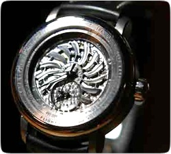 Круглый корпус изготовлен из титана, диаметром 41,5 мм, водонепроницаемый до 30 метров. Сапфировое стекло установлено на лицевой стороне корпуса (с антибликовым покрытием) и на его задней крышке. Циферблат, доступый в розовом золоте, желтом золоте или черный гальванизированный, отделан вертикальными "женевскими полосками", с минутной разметкой на фланце, в том числе часовые индексы, которые как и скелетонизированные часовая и минутная стрелка, покрыты черным люминесцентным составом. Модель оснащена швейцарским автоматическим механизмом Technotime TT738.04, на 43 камнях, с двумя заводными барабанами, 120-часовым запасом хода, функциями индикации часов, минут (посредством соответствующих центральных стрелок), даты (посредством ретроградной стрелки на дугообразной шкале от 3 до 12 часов), запаса хода (стрелочный указатель на 5 часах с прямой шкалой между 3 и 4 часами). Поставляется на черном кожаном ремешке. Лимитированный выпуск 30 экземпляров. Источник: http://forums.timezone.com/index.php...=6062214&rid=0 |