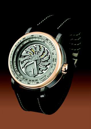 Круглый корпус из нержавеющей стали и из титана. Скелетонизированный циферблат с пластинами, стилизованными под лопатки реактивного двигателя, с черным PVD-покрытием. Такое-же покрытие на безеле и на заводной головке. Модель оснащена запатентованным круговым вычислителем истинной скорости полета (TAS = True Airspeed), определяемой на основании высоты полета и приборного указателя скорости. Расчет этого показателя производится с помощью двунаправленного вращающегося безеля. Автоматический механизм с функциями индикации часов, минут, секунд (посредством центральных стрелок), даты (в сдвоенной апертуре на 12 часах), а также - времени второго часового пояса (на боковом циферблате на 6 часах). Поставляется на черном перфорированном ремешке с белой прошивкой. Источник: http://www.europastar.com/news/10040...aviator-i.html |