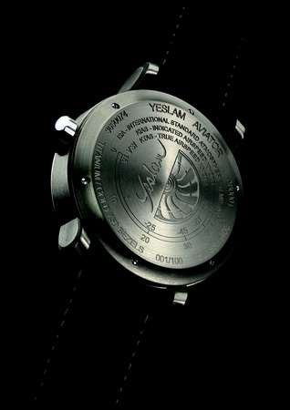 Круглый корпус, изготовленный из титана, диаметром 46 мм, водонепроницаемый до 50 метров. Вращающийся двунаправленный безель из кобальта с разметкой, позволяющей вычислять скорость объекта по отношению к скорости звука (Mach). Сапфировое стекло с двусторонним антибликовым покрытием защищает циферблат с радиальным гильошированием, накладными круглыми часовыми индексами, и стрелками, покрытыми люминесцентным составом белого цвета. Модель оснащена швейцарским автоматическим механизмом Reveil La Joux-Perret 5900, с балансовой частотой 28800 полуколебаний в час (4 гц), 42-часовым запасом хода, функциями индикации часов, минут, секунд, даты, времени второго часового пояса и с будильником. Поставляется на перфорированном кожаном ремешке. Источник: http://www.yeslam.ch/m.aviator3.html |
