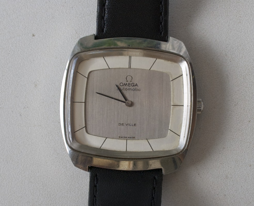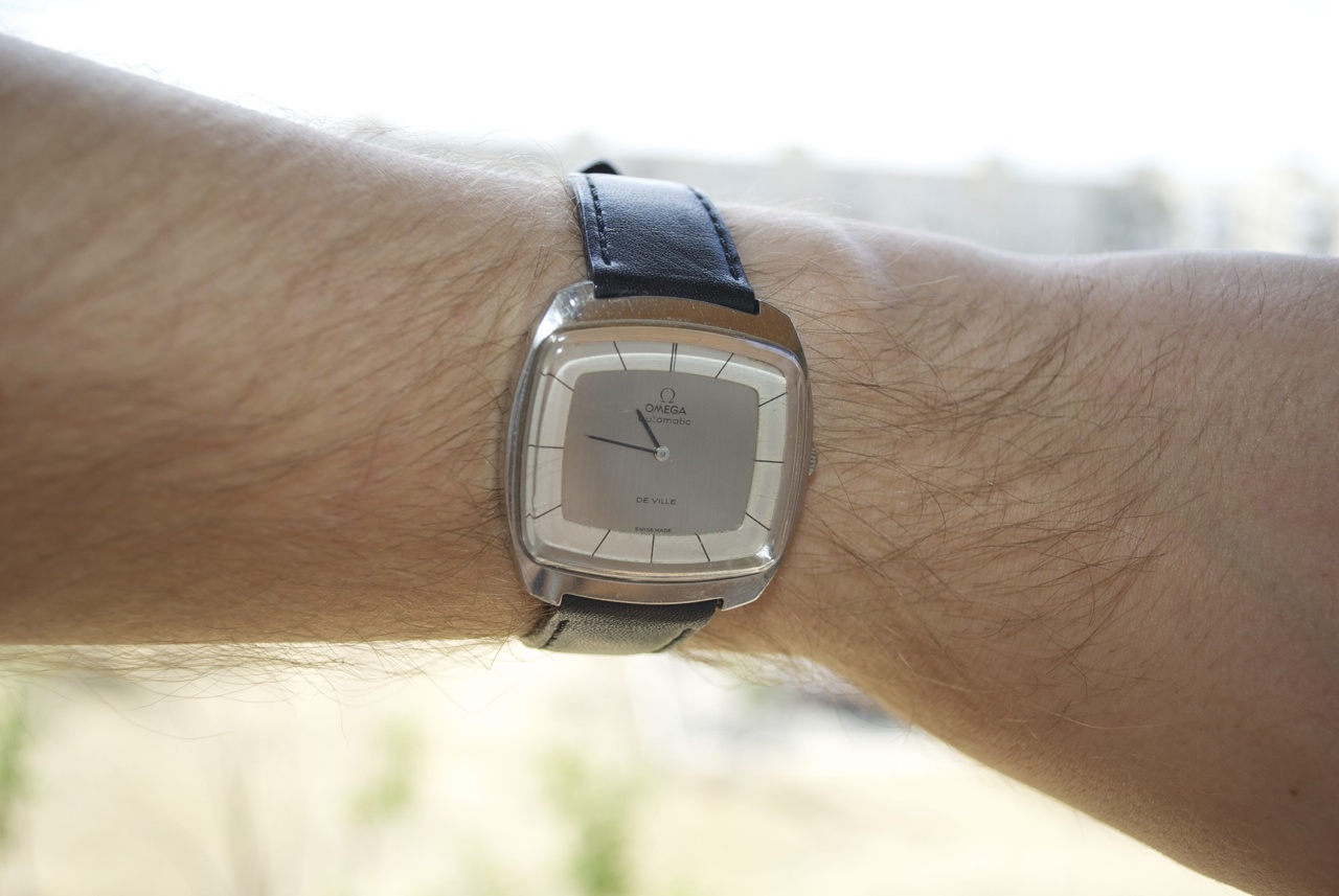 Недавно стал обладателем Omega De Ville 1976 года выпуска. Размер 36 на 36 мм, на моем некрупном запястье смотрятся вполне прилично. За две недели не ушли даже на минуту.