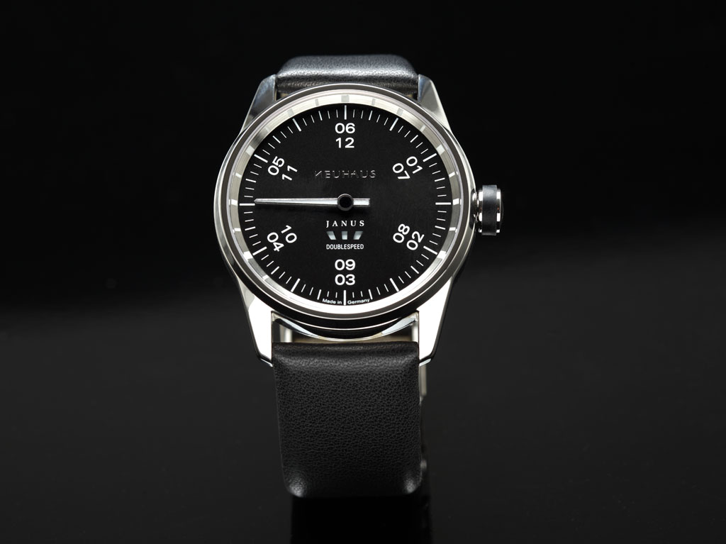Молодая независимая немецкая компания из Аугсбурга - NEUHAUS Inventing Timepieces (создана в 2009 году), представила регулятор JANUS DoubleSpeed. Модель отличается двойной скоростью (DoubleSpeed) движения стрелки, то есть она совершает оборот 360° в течение шести часов. В связи с этим, на черном циферблате имеется двойная разметка часов арабскими цифрами (дважды по шесть часов). Причем, каждый час размечен на полчаса, четверть и пять минут. Из-за увеличенной скорости вращения стрелки, промежутки между делениями на шкале в два раза больше, чем на обычном циферблате, что существенно облегчает считываемость показателей на циферблате новинки. На белых индексах и стрелке - люминесцентное покрытие. Индикация работы часов осуществляется в апертурах на 6 часах, в которых вращаются черный и белый диски, меняя цвет каждые две секунды.