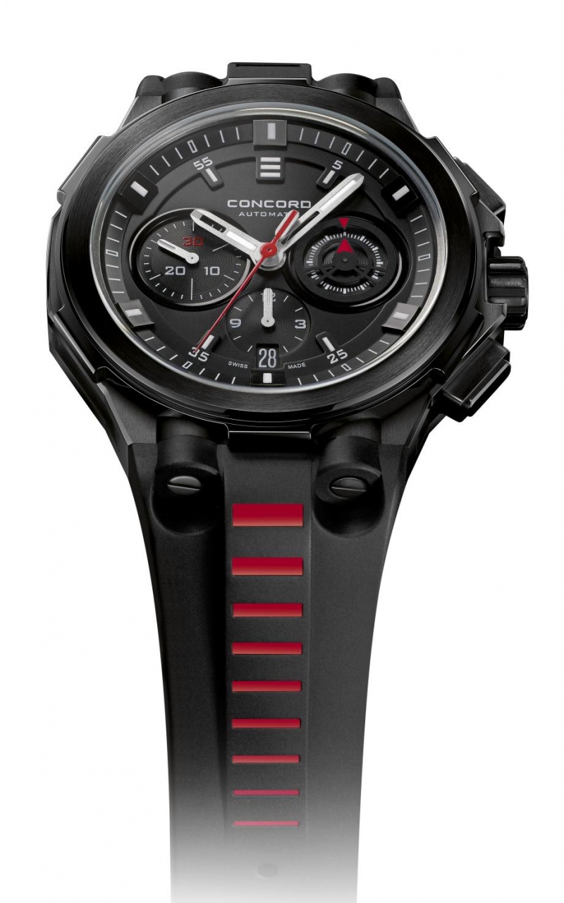 Новая модель C2 Neo-Black Chronograph от часовой компании Concord имеет корпус из нержавеющей стали с черным PVD-покрытием, диаметром 43 мм, толщиной 12,5 мм, водонепроницаемый до 100 метров. Сапфировое стекло, толщиной 2 мм, с антибликовым покрытием защищает черный многоуровневый циферблат с часовыми индексами и стрелками, покрытыми белым люминесцентным составом SuperLumiNova.
