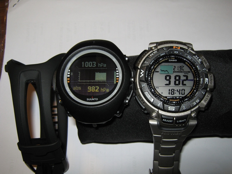 Вложение 161900 Абсолютное значение атмосферного давления оба аппарата измеряют совершенно одинаково с точностью до одного гПаскаля. Так как значение высоты - это производная , которая расчитывается на основании измерений атмосферного давления, то буду давать информацию и о барометрах. Далее укажу только различия у данных часов, которые проявляются в дополнительных возможностях обработки и вывода данных об атмосферном давлении. У Casio: - есть возможность калибровки датчика атмосферного давления; - показывает значение разницы соседних измерений давления; - возможность использования в расчетах значения относительной высоты, которая задается в меню; - У Suunto X10M: - возможность использовать встроенный GPS для определения высоты; - возможность задания "базового значения высоты" для расчета значения давления на уровне моря; - выводится скорость вертикального перемещения; - просмотр на дисплее абсолютного давления непосредственно в месте измерения и давления на уровне моря; - большая память измеренныз значений давления за 7 последних дней с возможностью удобного просмотра - на каждый из этих дней суточная гистограмма с указанием мин и макс значений давления; - |