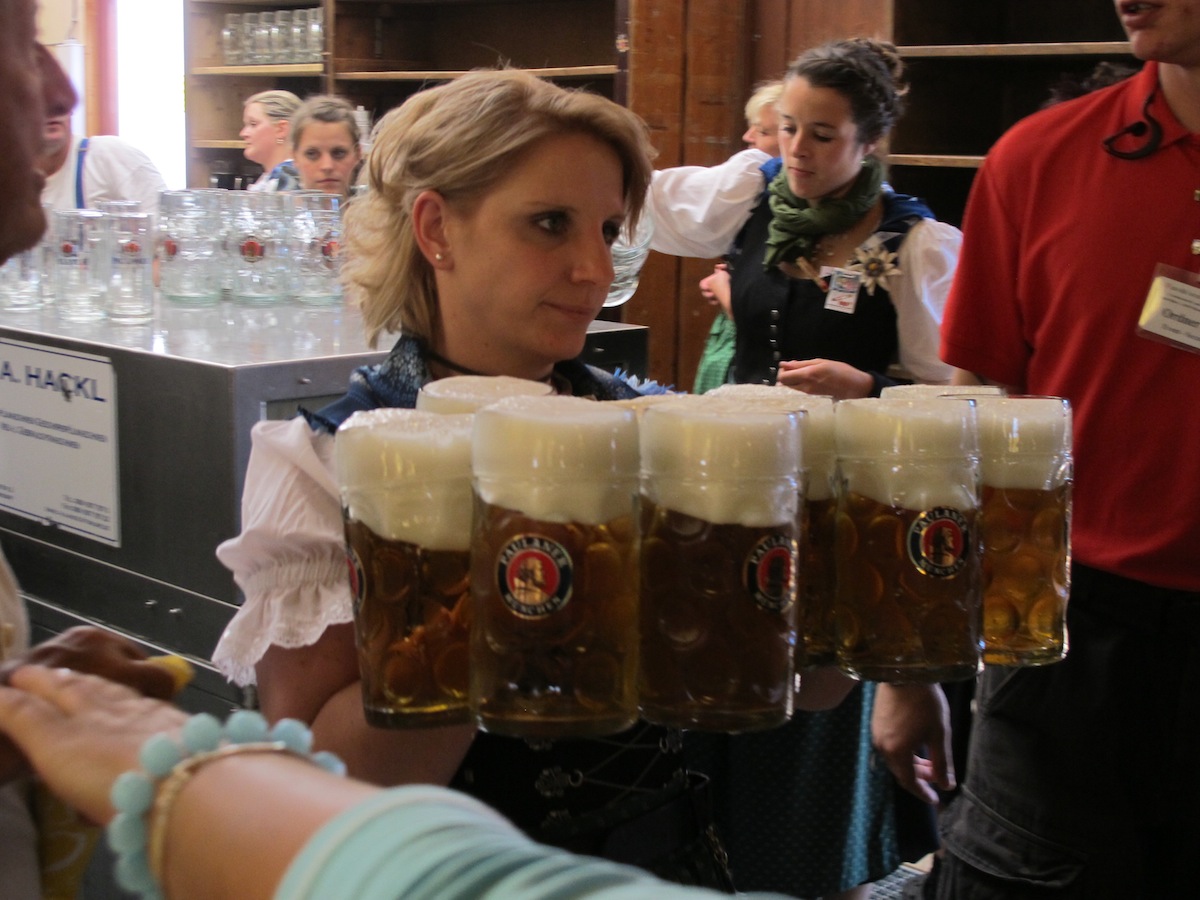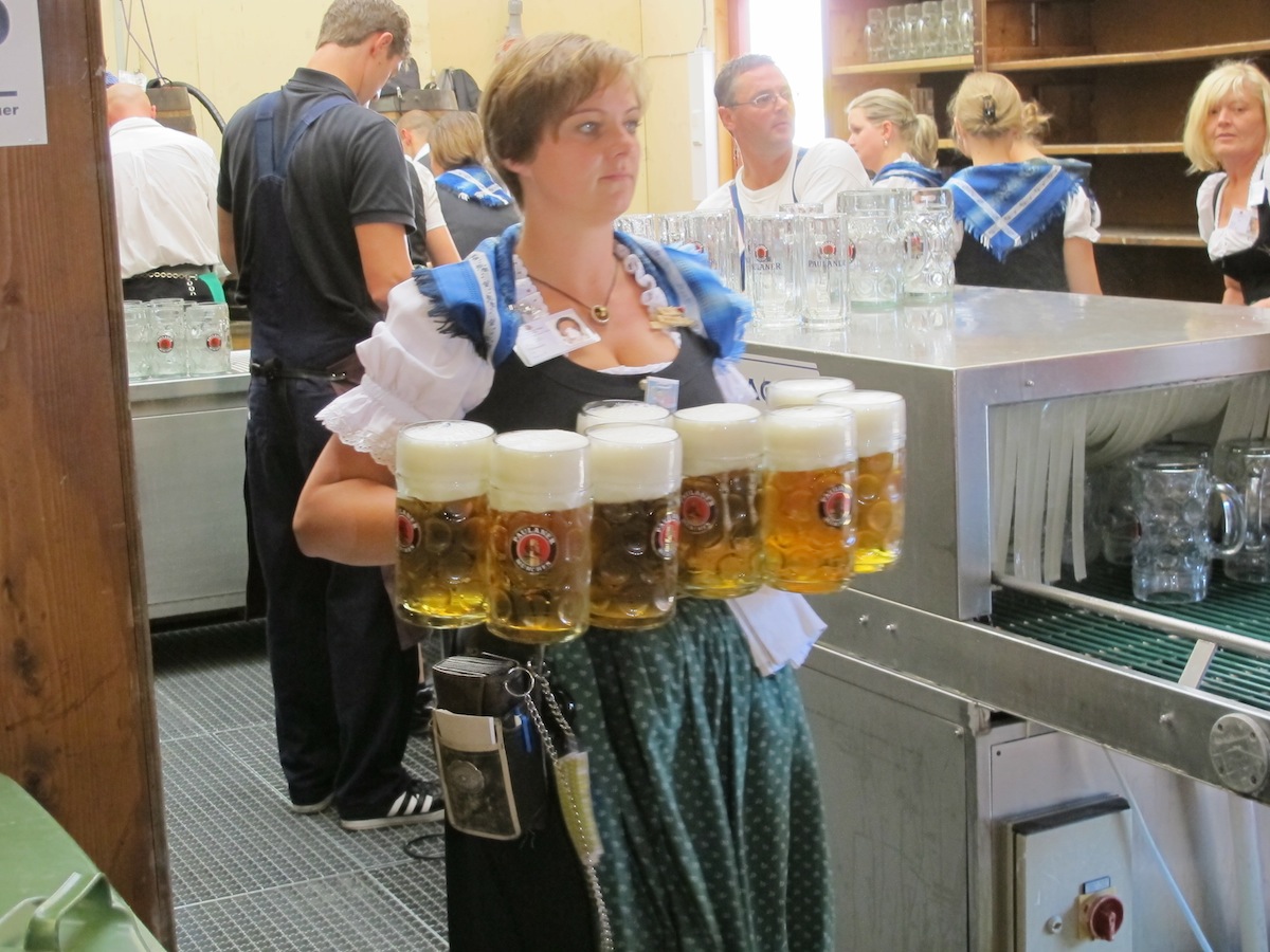 Как? Как они умудряются нести по 8 кружек пива? 8 литровых кружек! 8 кг + стаканы по полкилограмма весят! |