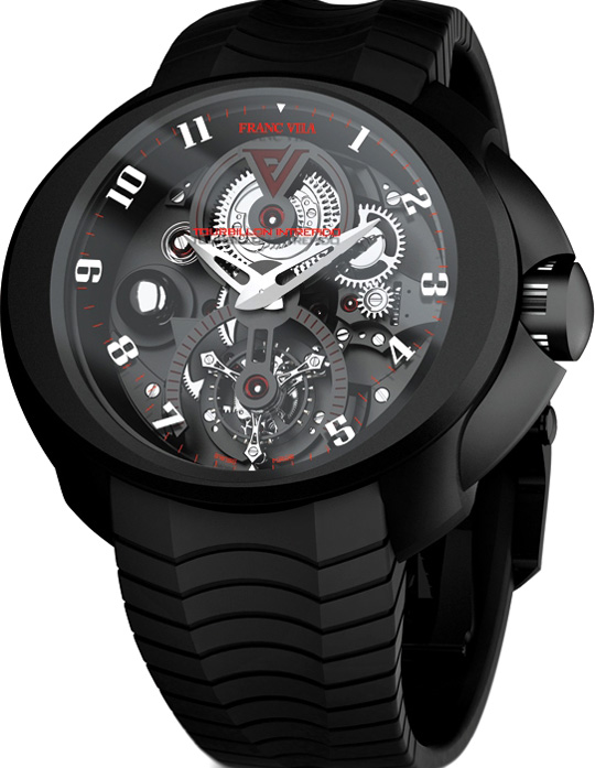 Корпус изготовлен из черного инновационного композитного материала на основе титана (Titanium Carbon-Graphene Deep NanoTube composite), отличающегося легкостью и большой прочностью. Водонепроницаемость составляет 100 метров. Защищенная заводная головка. Сапфировое стекло на лицевой стороне корпуса и на его задней крышке. Частично скелетонизированный циферблат с белыми арабскими цифрами и скелетонизированными стрелками. Модель оснащена механизмом с ручным заводом, с запасом хода 96 часов, функциями индикации часов, минут, дня/ночи и с турбийоном. Поставляется на черном каучуковом ремешке. Лимитированный выпуск 8 экземпляров. Источник: http://watches.infoniac.com/franc-vi...ido-watch.html |