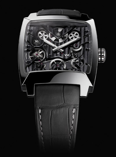 Корпус выполнен из полированного титана и матового нитрида кремния, со стороной 41 мм (вместо 39 мм в предыдущей версии модели), водонепроницаемый до 50 метров. Титановая заводная головка на 3 часах. На лицевой стороне корпуса расположено скошенное сапфировое стекло с двухсторонним антибликовым покрытием. На задней крышке корпуса - трехсекционное сапфировое стекло. Циферблат с семью мостами, покрытыми матово-черным рутением, вручную отделанными Côtes de Genève. На нем просматриваются спуск и ременная передача. Родированные минутная и часовая стрелки, с белым люминесцентным покрытием. Белая гравировка "V4" на 4 часах, а также эмблема TAG Heuer на 10 часах. Модель оснащена мануфактурным автоматическим механизмом с ременной передачей, соединяющей две пары заводных барабанов, установленных параллельно. Автоподзавод линейный вольфрамовый. Функции индикации часов, минут (посредством центральных стрелок) и секунд (посредством секундной стрелки на 4 часах). Поставляется на черном ремешке из кожи аллигатора с титановой раскладной застежкой. Лимитированный выпуск 200 экземпляров. Цена модели составляет 65000 швейцарских франков. В продаже ожидается с октября 2011. Источник: http://www.worldtempus.com/en/news/t...m-and-ceramic/ |